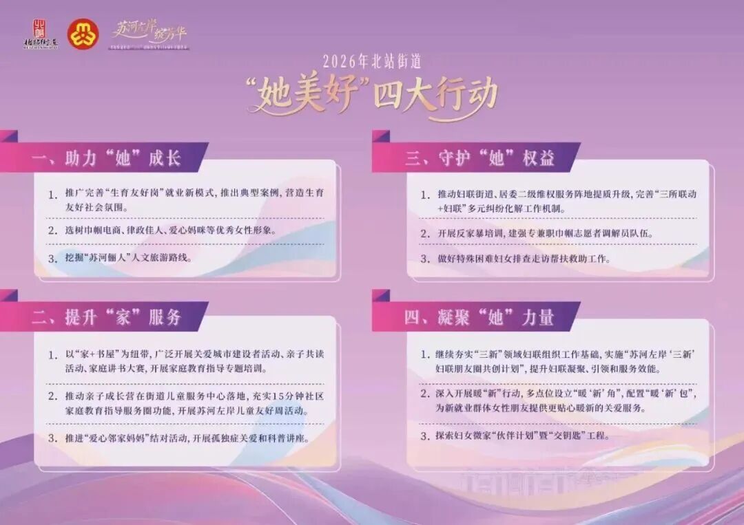 《2026年北站街道“她美好”四大行动》同步发布,进一步凝聚“她智慧”、激发“她动能”,引领广大女性在苏河左岸经济社会高质量发展中撑起“半边天”。