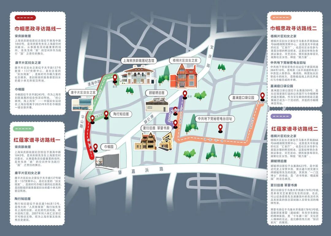 “巾帼思政寻访线路”以“读巾帼·砺初心”为核心,从上海宋庆龄故居纪念馆出发,途经康平片区妇女之家,抵达巾帼园。1.4公里的路程里,循着杰出女性的足迹,回望历史征程中的巾帼芳华。在宋庆龄故居,感悟伟大女性将个人命运与国家、民族紧密相连的家国情怀;于康平片区妇女之家,看见当代女性在基层治理中凝聚的“她力量”;走进巾帼园,在妇女运动历程展中触摸百年妇女解放的历史脉搏,让巾帼初心在寻访中愈发坚定。