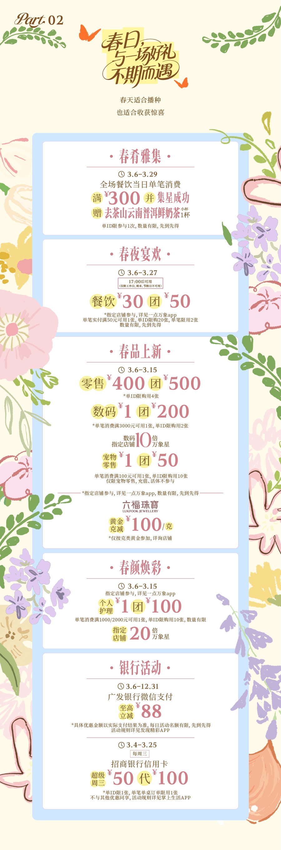 餐饮满300元赠指定茶饮,30元团50元夜场优惠;