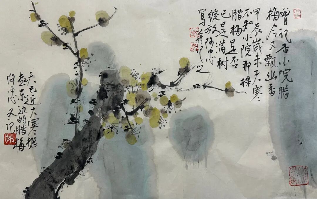 “夜闻梅香失醉眠,归来却梦寻花去。梦里花仙觅奇句,玉蕊檀心两奇绝。”是苏轼为蜡梅写的诗。写出了人们对蜡梅的感官认知,赋予花苞、花蕾人性化情感。玉蕊、檀心是感官与视觉的融合;黄庭坚也有两首咏蜡梅的诗:“金蓓锁春寒,恼人香未居。虽无桃李颜,风味极不浅。”“体熏山麝脐,色染蔷薇露。披拂不满襟,时有暗香度。”诗中的审美调动了视觉、嗅觉,让人越品越有味道。远观鹅黄云蒸霞蔚、灼灼其华,花绽枝头、清瘦孤傲,矮墙映衬、凌寒独开,疏影横斜水清浅;恼人香未展,香气清冽,沁人心脾,体熏山麝脐,披拂时有暗香度,此时应该闻到了蜡梅的清香。
