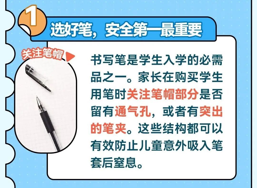 有些儿童笔的笔帽上或者尾端上,镶着晶莹剔透的小物件,让孩子们爱不释手,甚至还有的笔帽是一个削笔刀……如果被孩子误吞,有可能会被固定在喉咙下而阻塞气管,带削笔刀的还可能伤害喉咙,非常危险。