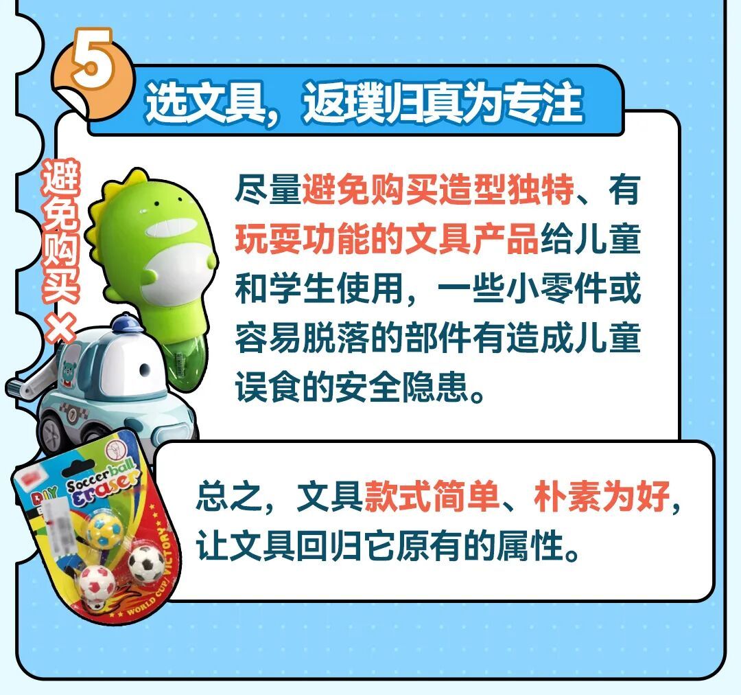 市面上不少文具为了吸引儿童购买,在产品上附加趣味性小零件装饰品。为避免儿童将这类文具上的饰物当成玩具玩耍,引发吞咽、噎住,甚至窒息等意外事件,不建议家长为儿童选购“趣味强”的文具。