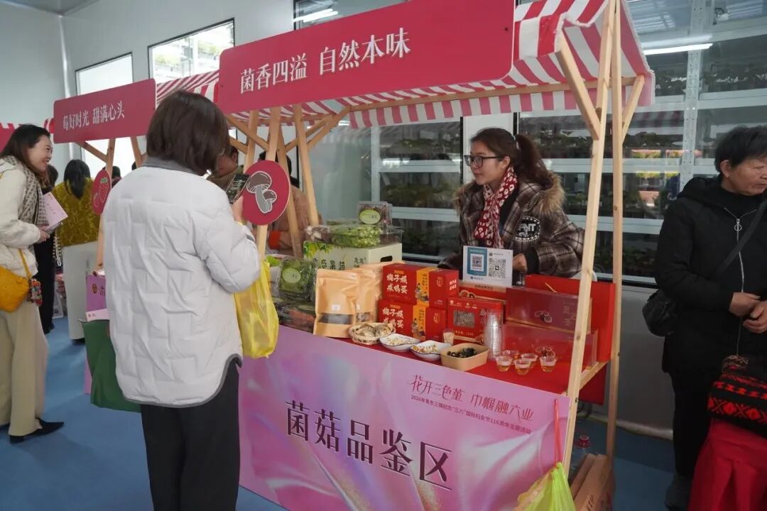 活动现场还设置了巾帼农韵、巾帼传艺、巾帼漫游、巾帼雅韵、巾帼活力五大体验区,从菌菇、草莓品鉴到非遗编织教学,从新中式服装体验到趣味跳绳PK等,沉浸式的体验让现场妇女干部感受巾帼力量赋能产业发展的丰硕成果。