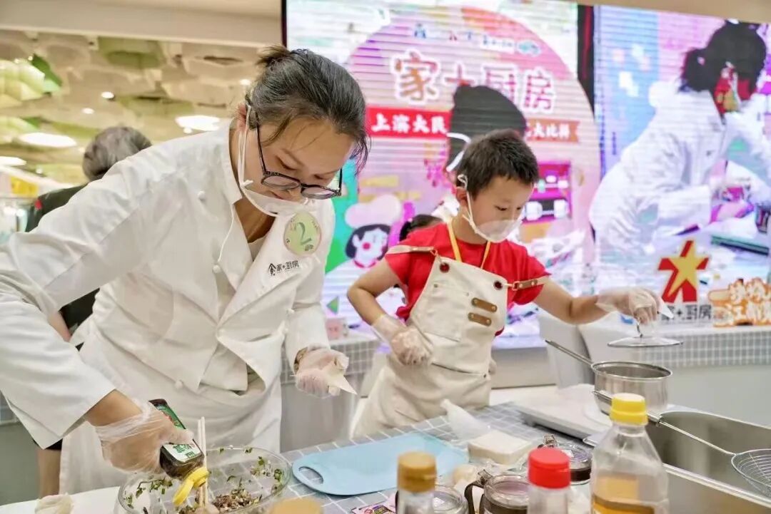 3月4日,在刚焕新启幕的虹口区少儿发展中心“家+厨房”活动现场,上海本帮菜非遗代表性传承人秦卓男团队正为家长们传授儿童营养餐制作技巧。