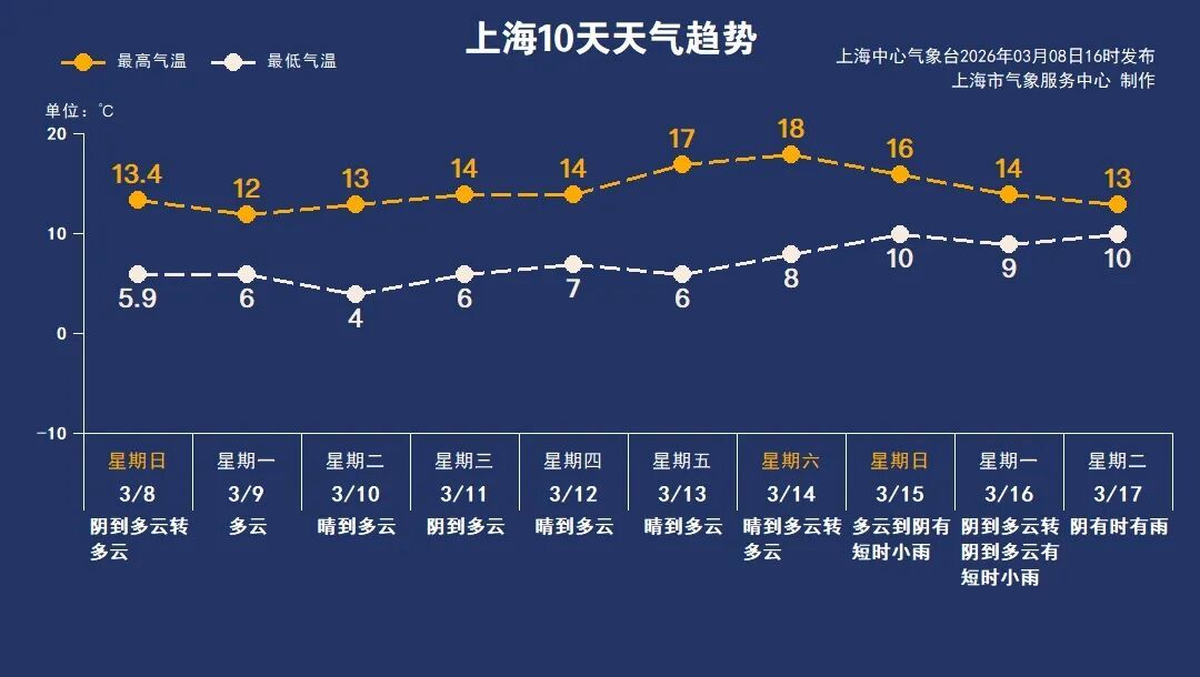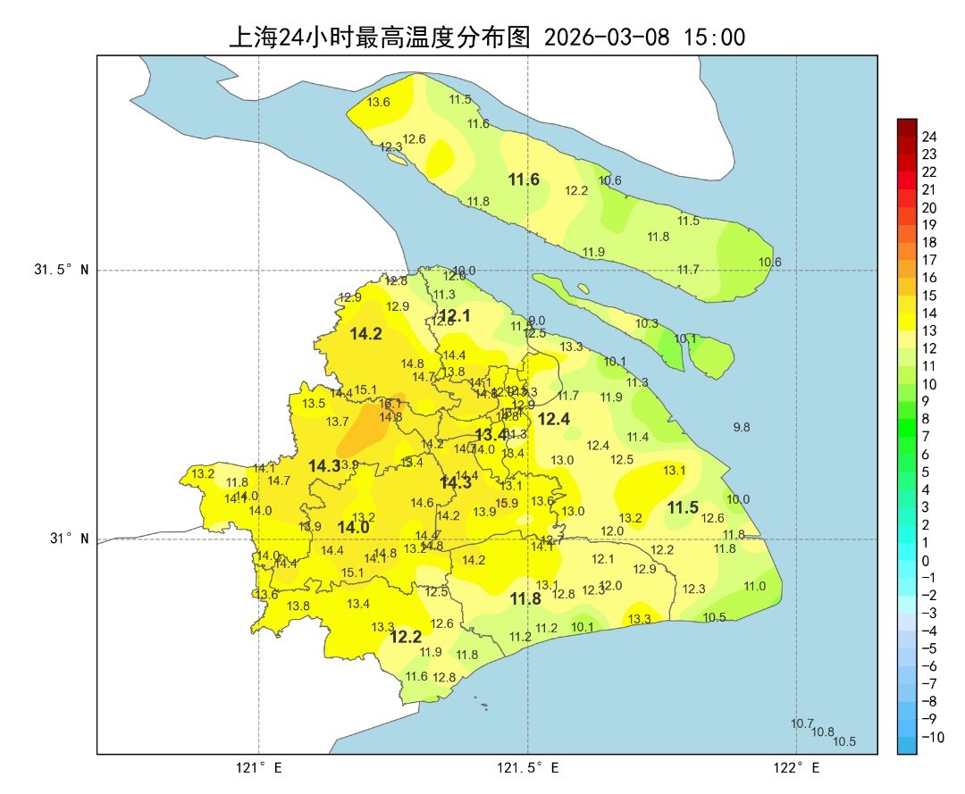 今天早晨申城天空云系略多,气温也停留在低位。中午前后阳光拨开云层逐渐展露,气温跟着上涨,全市最高气温升至11~14℃附近,徐家汇站13.4℃。户外天高云淡春色宜人,整体也算舒适。