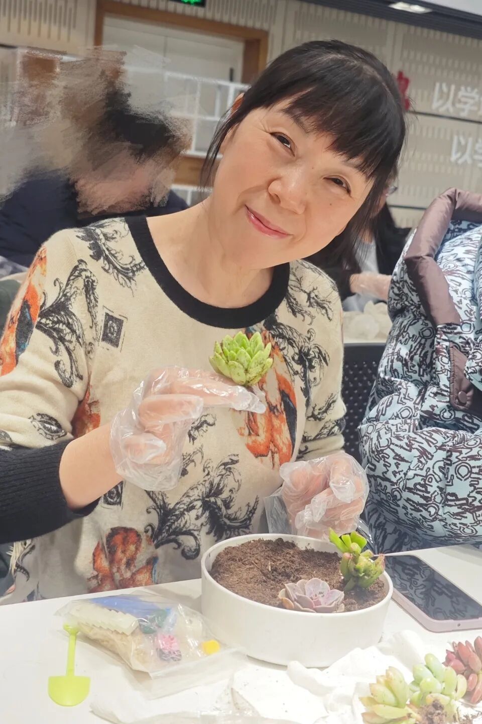 活动当天,高境镇社区党群服务中心教室绿意萌动,生机盎然。一场面向机关企事业单位女职工的“手植春光·芳华与共”多肉微景观制作活动在此进行。女职工们暂时放下繁忙的工作,化身巧手“园丁”,填土、种植、铺石、点缀……大家专注于手中的方寸天地,将一抹抹鲜活的绿意与对美好生活的向往一同“栽种”进别致的陶瓷容器中。