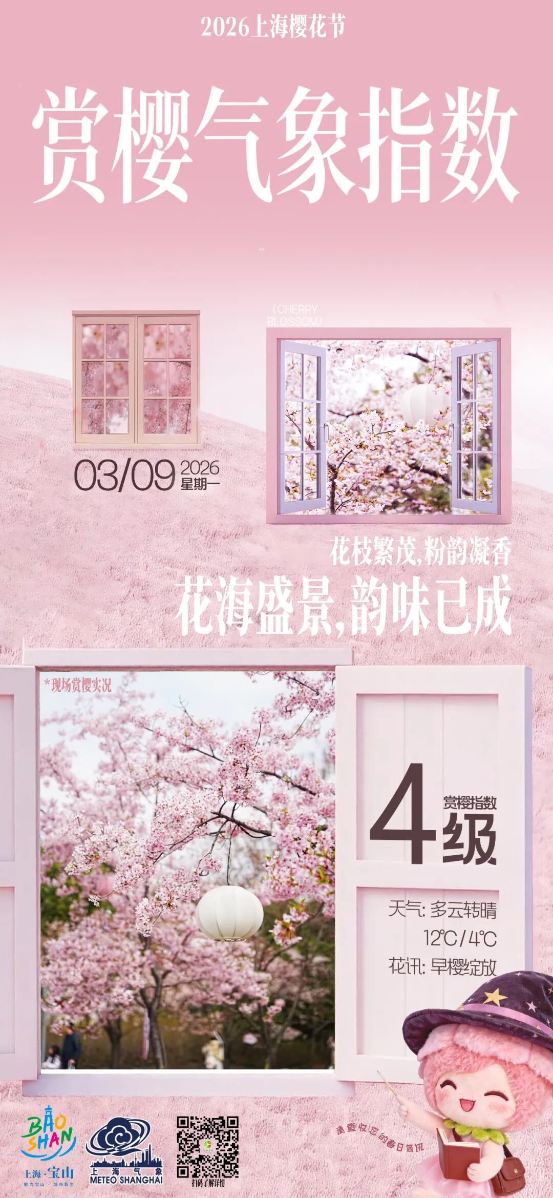 三月的风吹开了顾村公园的第一片樱云,盼了一冬的浪漫,正随着早樱的绽放,缓缓铺开成春日最美的画卷。为让大家不错过最佳花期,科学规划赏樱行程,我们特别推出“上海樱花节—赏樱气象指数”。广大市民游客可根据每日发布的指数等级,轻松判断当日是否适宜赏樱,让春日出行更有把握!