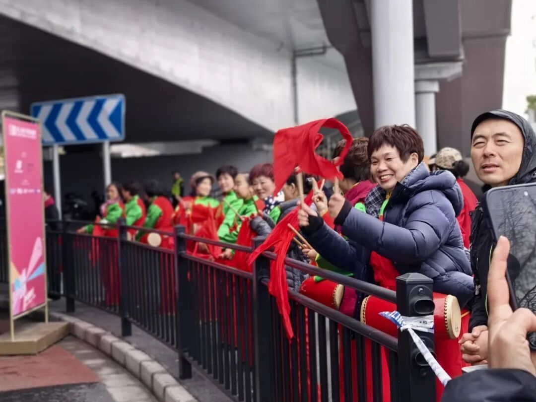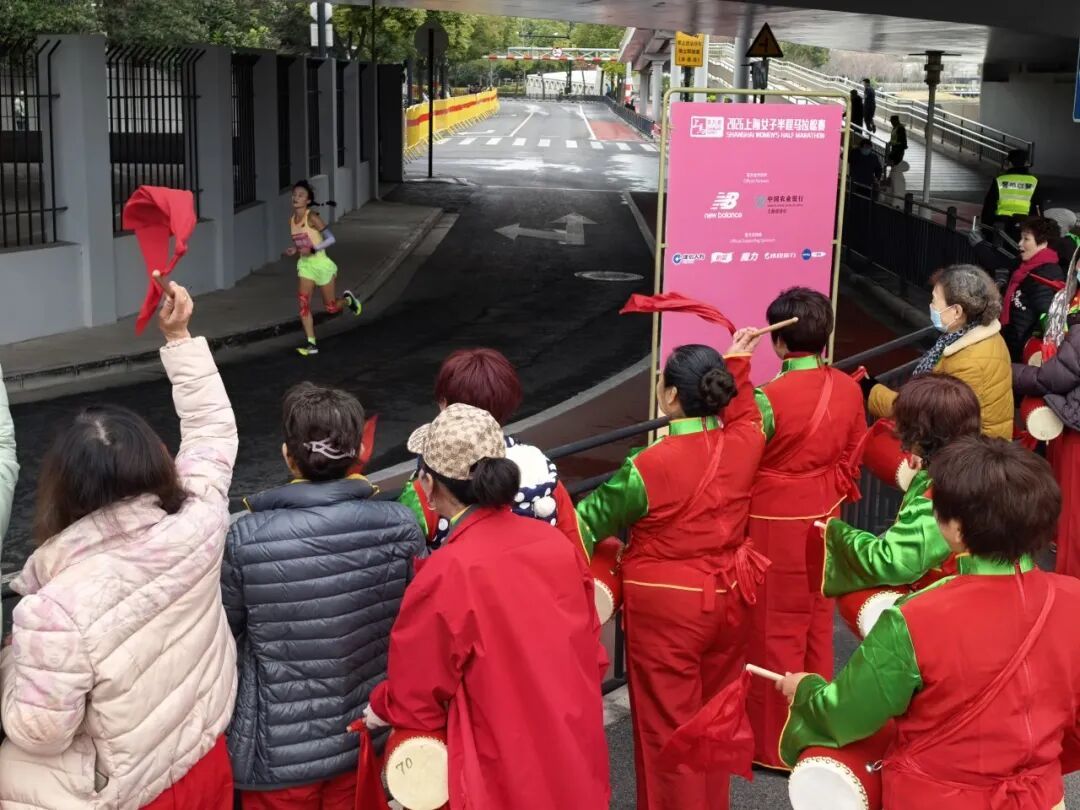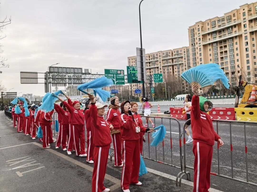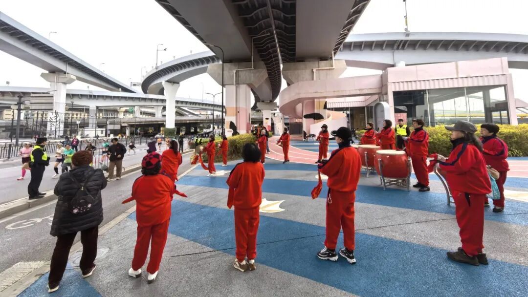 随着领跑选手的身影逐渐清晰,淞虹路桥下的助威点瞬间沸腾了起来。一支身着鲜艳服饰、精神焕发的北新泾腰鼓队率先登场,队员们手持鼓槌,动作整齐划一,铿锵有力的鼓点如同奔涌的脉搏,与跑者们稳健的步伐形成独特的和鸣。