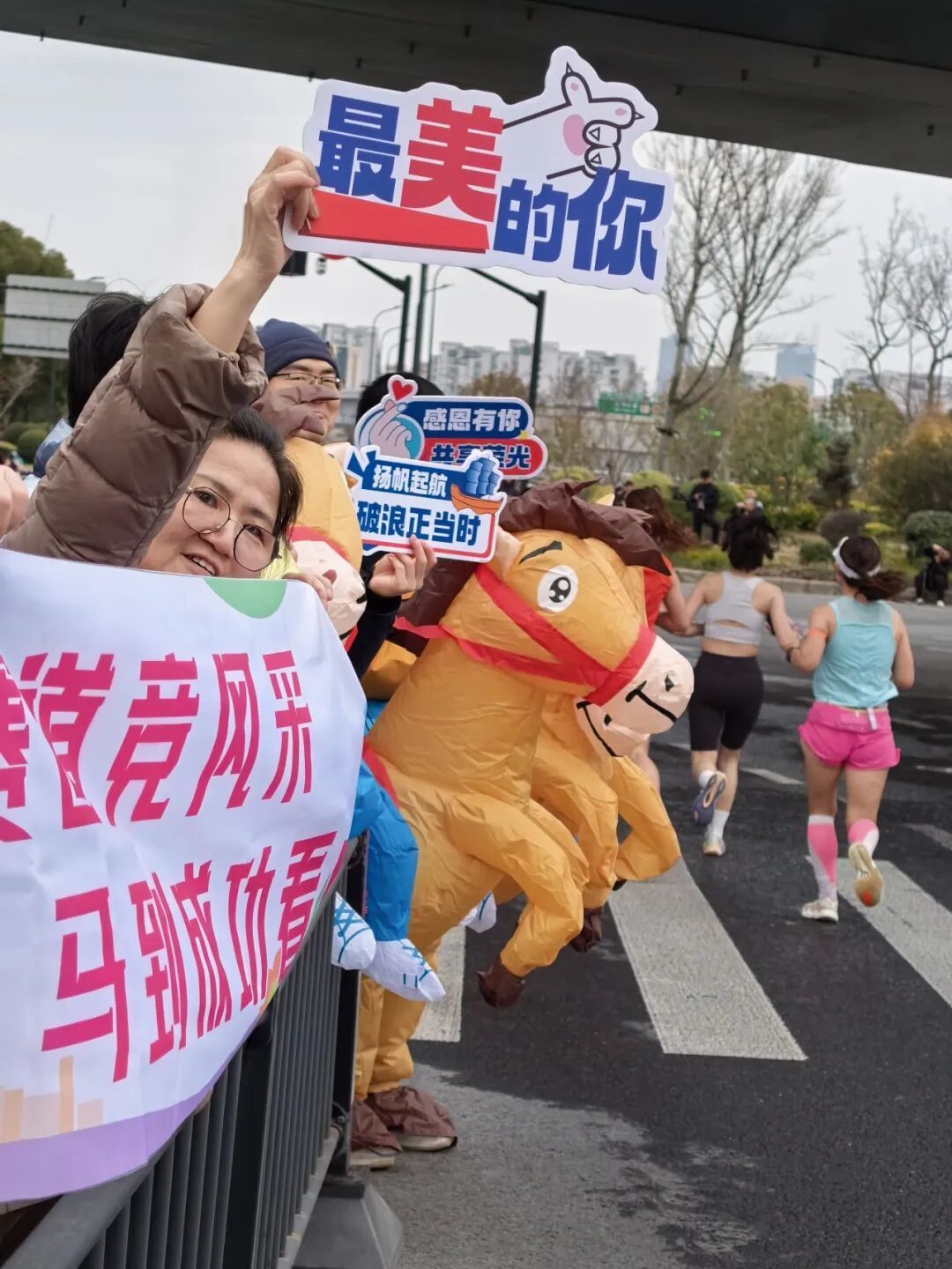 行至剑河路桥下,三位身着“半人半马”人偶服的志愿者化身“半马吉祥物”,与跑者挥手互动,为紧张激烈的比赛注入了轻松愉快的氛围。一旁拉横幅的社区志愿者则用一声声呐喊,为选手们送上真挚的祝福。
