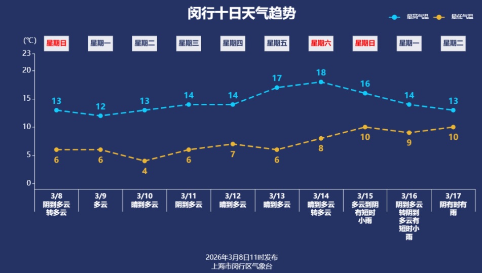 据最新气象资料分析:未来一周受高空西北气流控制,本区以多云天气为主,白天气温回升。下一次降水过程出现在15—17日。 今天早晨全区大部最低气温在4~6℃之间,闵行国家基本气象站为5.3℃,仍有早春的寒意。今天相对湿度在85%~55%之间,天气总体适宜大家出行。 明日天气 明天云量偏多,阳光有机会露脸,最高气温12℃,最低气温6℃。北到东北风4—5级,沿江地区阵风有6级。 天气趋势 下周工作日阳光几乎全勤,周初多云为主,其中明天(周一)受冷空气扩散影响,风力增大,周二早晨气温较低,本区最低气温4℃。