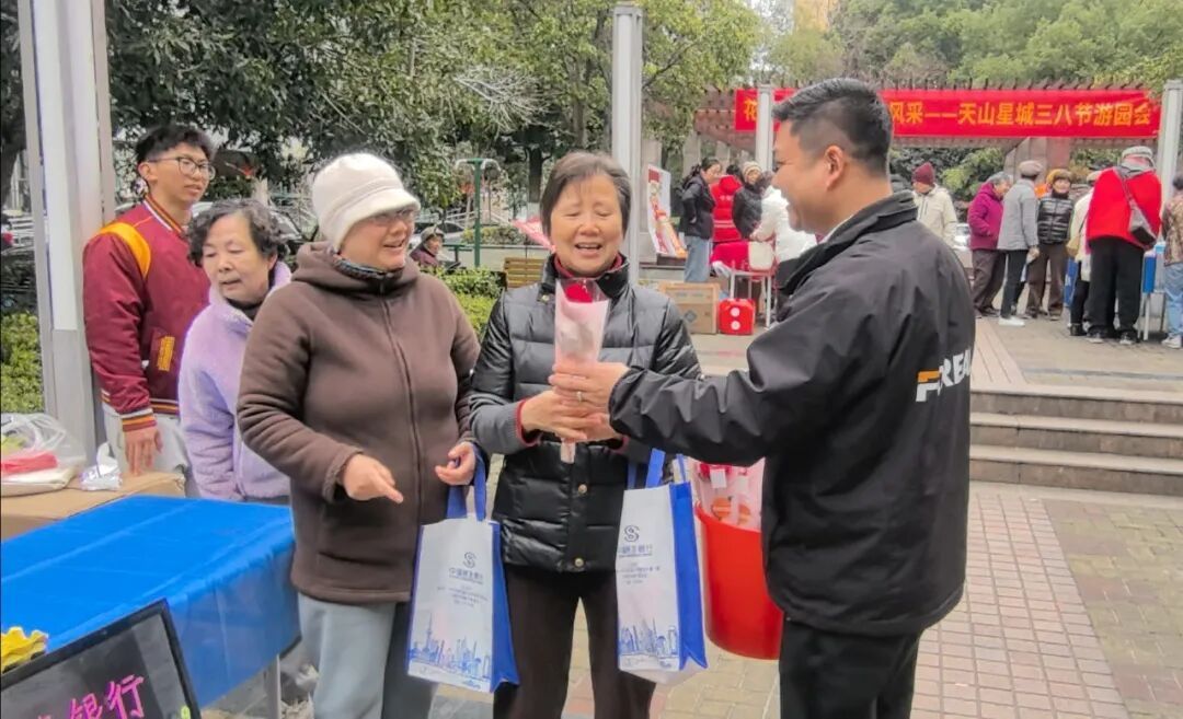 新泾镇天山星城居民区在梦悦亭广场举办“花开三月天,巾帼绽风采”主题游园会。益智拼图、投壶、踢毽子、套圈……丰富有趣的互动项目让女性同胞们在轻松欢乐的氛围中一展身手。彼此间的加油鼓劲,让笑声与掌声此起彼伏。小区物业更贴心地为到场的女性送上鲜花,用芬芳传递节日的温暖与敬意。