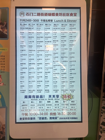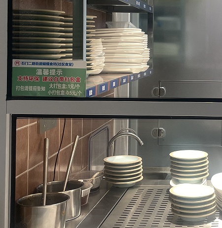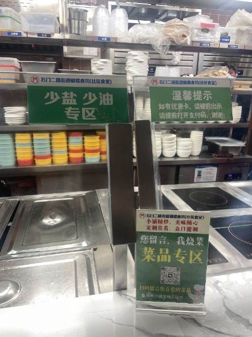 食堂日均服务近千人次,覆盖居民、白领等多类群体,提供早六点半至晚八点的全天候餐饮服务。设立“少盐少油无糖专区”“双拼专区”,并以三色标签标识菜品健康等级,方便居民按需选择,食堂不主动提供一次性餐具与塑料袋,所有餐具统一回收消毒、循环使用,鼓励居民自带水杯,使用可循环餐盒,并通过电子屏滚动播放“光盘行动”“限塑先行”等宣传内容,倡导文明就餐新风尚,不断积极传递环保与健康的理念。