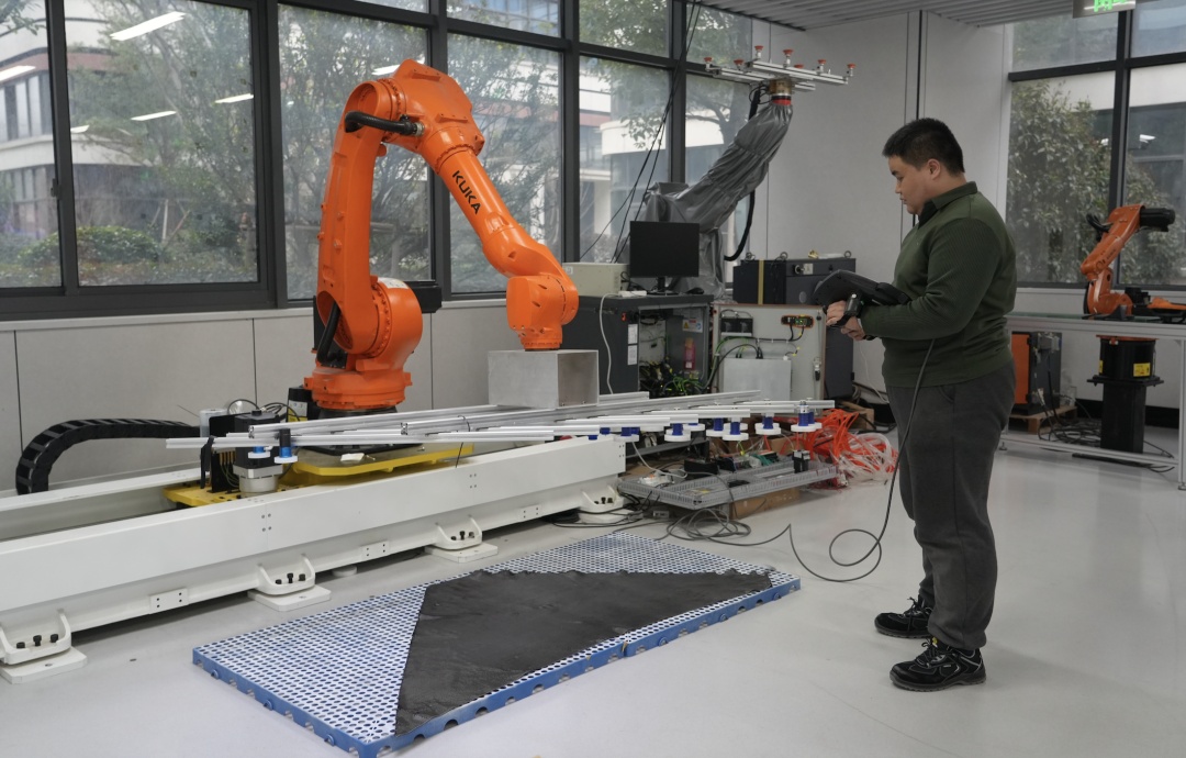 如果说丸旭电子代表的是“链主的崛起”,那么工博士机器人技术有限公司(以下简称“工博士”)则代表了“技术的突围”,企业展厅内,全国首台碳纤维布料抓取搬运机正在做展出调试。