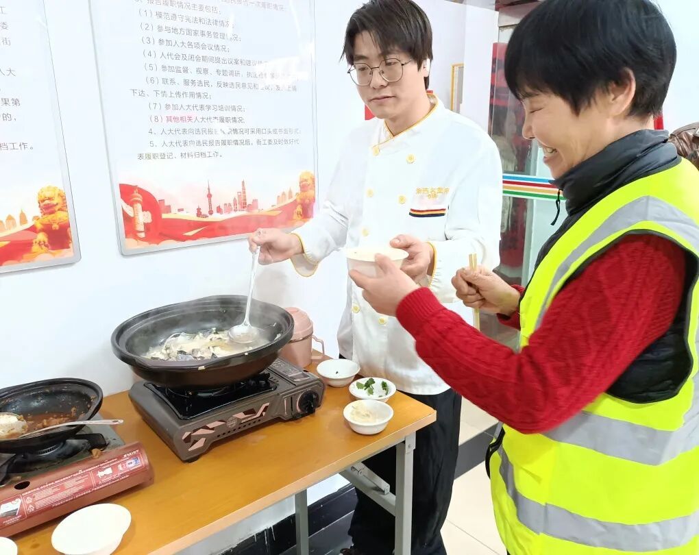 共建单位的深度参与成为本次活动的一大亮点。在美食教学区,辖区饭店“浙西名菜府”的男厨师长现场演示了招牌名菜“鱼头汤”的制作工艺。从选材到火候,厨师长边操作边讲解,将后厨秘笈倾囊相授。品尝着鲜美的鱼头汤,大家赞不绝口,有妇女代表表示,要将学到的厨艺运用到社区为老服务中,让独居老人也能尝到“家的味道”。