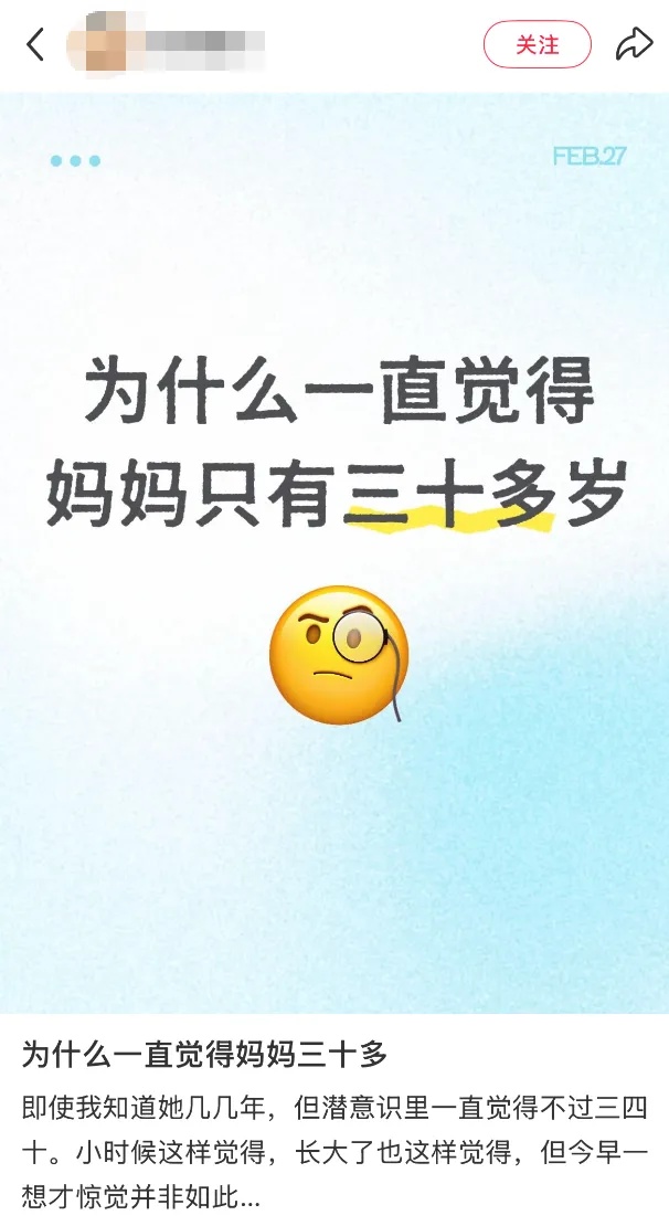 最近一个帖子在社交平台火了发帖人提出了一个神奇的“困惑”“为什么一直觉得妈妈只有三十多岁?”许多网友表示深有同感“或许人对身边人年龄的感知是初次相遇的时间”不记得从何时开始懵懂的我们开始记事开始认知到爸爸妈妈的年龄儿时计算倍数的数学题至今依然印象深刻“因为那年妈妈的年龄是我的四倍”有网友回忆记忆里的妈妈总是时髦又美丽是给我们温柔宠爱严厉教导我们成长的仿佛无所不能的“大人”模样但回过神来妈妈已经成了小朋友们口中的“奶奶”已经有很多年没再穿过高跟鞋爸爸也成了别人口中的“老人”