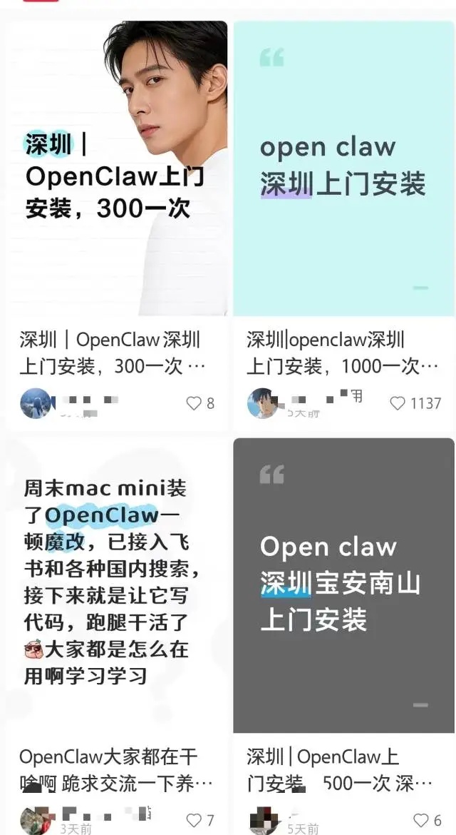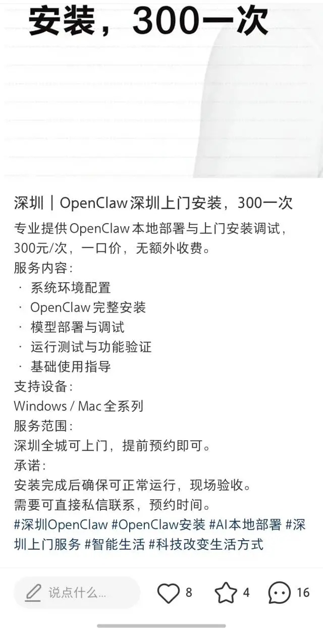 在国内社交平台上,“OpenClaw上门安装调试”的帖子随处可见。收费标准五花八门:远程安装300元起步,上门服务则从500元到1500元不等,服务内容涵盖本地部署、调试运行和基础使用指导。