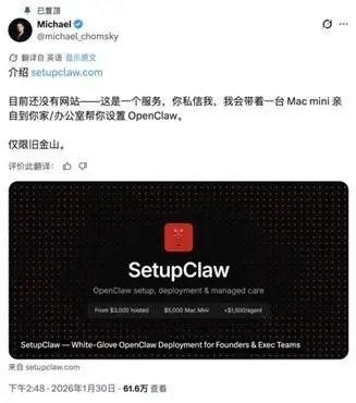 一家名为SetupClaw的代装平台已给出明码标价:托管安装3000美元,含Mac mini硬件的远程配置5000美元,现场配置更是高达6000美元。
