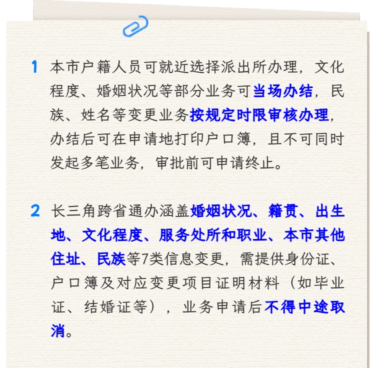 据上海一网通办总门户介绍,上海公安人口管理部门通过简化材料、优化流程、一网流转,让数据多跑路、群众少跑腿,切实提升市民办事体验。目前,已实现本市户籍人员户口登记信息变更“全市通办”,长三角户籍人员部分户口登记信息“跨省通办”。 点击“划重点”极速浏览↓↓↓ 变更文化程度、婚姻状况、服务处所和职业、本市其他住址、籍贯、出生地业务,市民可至本市任一派出所申请并当场予以办理。 变更民族业务,市民可至本市任一派出所申请,并由户籍地派出所在3个工作日内完成审核办理。 变更姓名、性别、出生日期业务,市民可至本市任一派出所申请,并由户籍地派出所在3个工作日内作出审核受理意见,受理成功后将按规定审批时限审核办理。 具体时限及材料要求,可关注“上海公安人口管理”微信公众号,点击页面下方“便民服务”,选择“标准版”,进入“告知单”界面获取业务告知单。 申请人不可同时发起多笔“全市通办”业务,需待一笔业务办结后,才可再次申请发起新的一笔。“全市通办”业务办理期间,同一业务也不得重复申请。 可以。“全市通办”业务受(办)理前,申请人可前往申请地或户籍地派出所申请终止“全市通办”业务。但业务经审批同意后不得终止,不得中途取消。 “全市通办”业务办结后,申请人在申请地派出所即可完成打印,无需返回户籍地派出所打印。 适用对象:上海市,江苏、浙江、安徽省户籍(家庭户)居民。 户籍信息变更种类:婚姻状况、籍贯、出生地、文化程度、服务处所和职业、本市其他住址、民族。 办理材料:申请人《居民身份证》《居民户口簿》及具体变更项目需提供的证明材料。具体包括: 变更婚姻状况另须提供:《结婚证》或《离婚证》或离婚判决书等;丧偶的需提供《结婚证》和死亡方户籍注销证明。 变更籍贯另须提供:祖父的《居民户口簿》或《户籍证明》等;与祖父的关系证明。 变更出生地另须提供:出生证明。 变更文化程度另须提供:毕业证书。 变更服务处所和职业另须提供:社保缴纳证明,无业的需提供《就失业证》或《劳动手册》或《退休证》等。 变更其他住址另须提供:有效房屋权证或实际居住凭证等。 变更民族另须提供:户籍地设区的市人民政府民族事务部门审批同意变更民族成分证明。 申请办理长三角区域跨省(市)户籍信息动态项目变更业务后,不得中途取消。 综合自:上海发布、上海一网通办总门户 编辑:宁平英 转载请注明来自上海徐汇官方账号