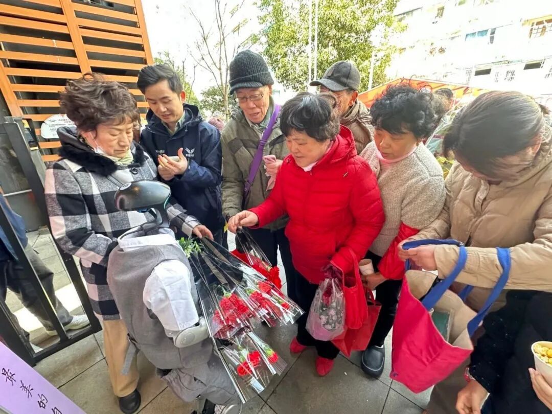 这是发生在仁慧苑公益市集——“3·5学雷锋·我为群众办实事”主题党日活动中的一幕。本次活动立足“十五五”规划开局之年,融入科技创新元素,于是,这台人形机器人“志愿者”成为了全场最大亮点。它不仅与居民亲切互动、合影留念,现场表演欢快舞蹈,更特意为到场的女性居民献上娇艳鲜花,用清脆语音送上“祝各位女神节日快乐、芳华永驻”的诚挚祝福,以科技传递温情,为活动增添别样风采。
