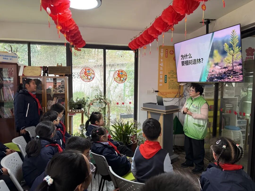 初春的常馨生境花园草木萌发,野趣盎然。绿苑小学的少先队员代表带着对自然的好奇与期盼来到这里,生境联盟志愿者专家团的讲师王吟为孩子们带来了一场生动有趣的互动科普。“为什么要植树造林?”“一棵树能为我们地球带来什么?”王吟抛出的一个个问题瞬间点燃了孩子们的好奇心。结合植树节的由来与意义,她向孩子们讲解了树木的生态价值——保持水土、净化空气、为生物提供栖息地……在轻松活跃的问答中,孩子们不仅学到了知识,还懂得了“守护绿色就是守护家园”的道理。