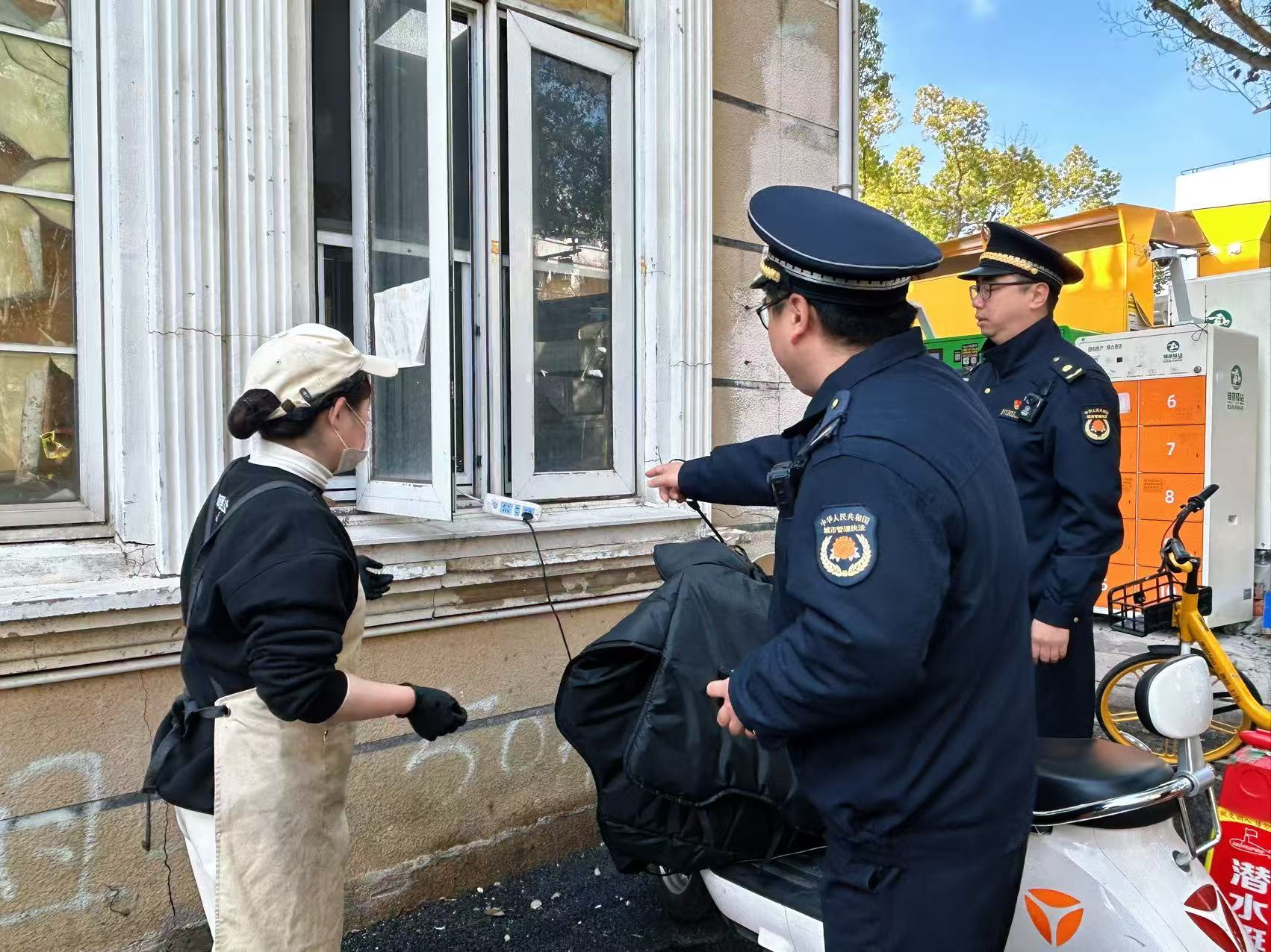 针对背街小巷易出现的乱堆垃圾、飞线充电等行为,执法队启动联动机制,由第三方协管员开展全天候巡查,与执法队员实时对接处置。巡查中,协管员发现有店员私拉拖线板为电动车充电,执法人员立即上前劝阻纠正。执法队大学城分队长李伟介绍,整治坚持“先教育、后处罚”原则,以宣传引导、上门规劝为主,督促商户文明守法经营。