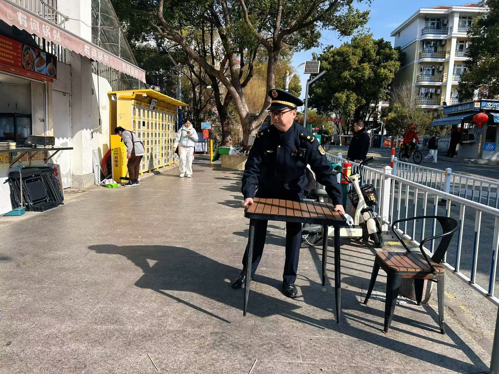 文汇路作为贯穿松江大学城的核心商业街,是此次保障行动的重点区域。3月9日一早,执法人员分组开展日常巡查,重点整治无序设摊、跨门经营、占道经营等问题。在一家新开业餐饮铺门口,店主将桌椅、纸箱摆放在人行道上,影响行人通行。执法人员现场耐心劝导,讲解市容管理规定与安全隐患,并协助店主将物品搬入店内,及时恢复道路畅通。