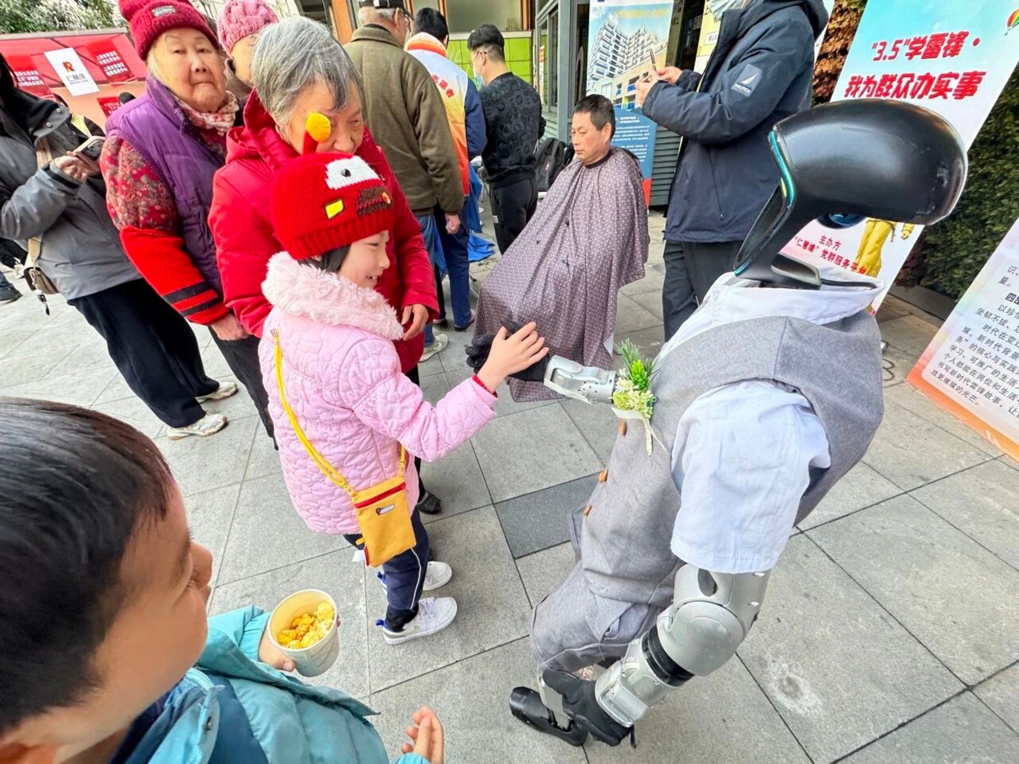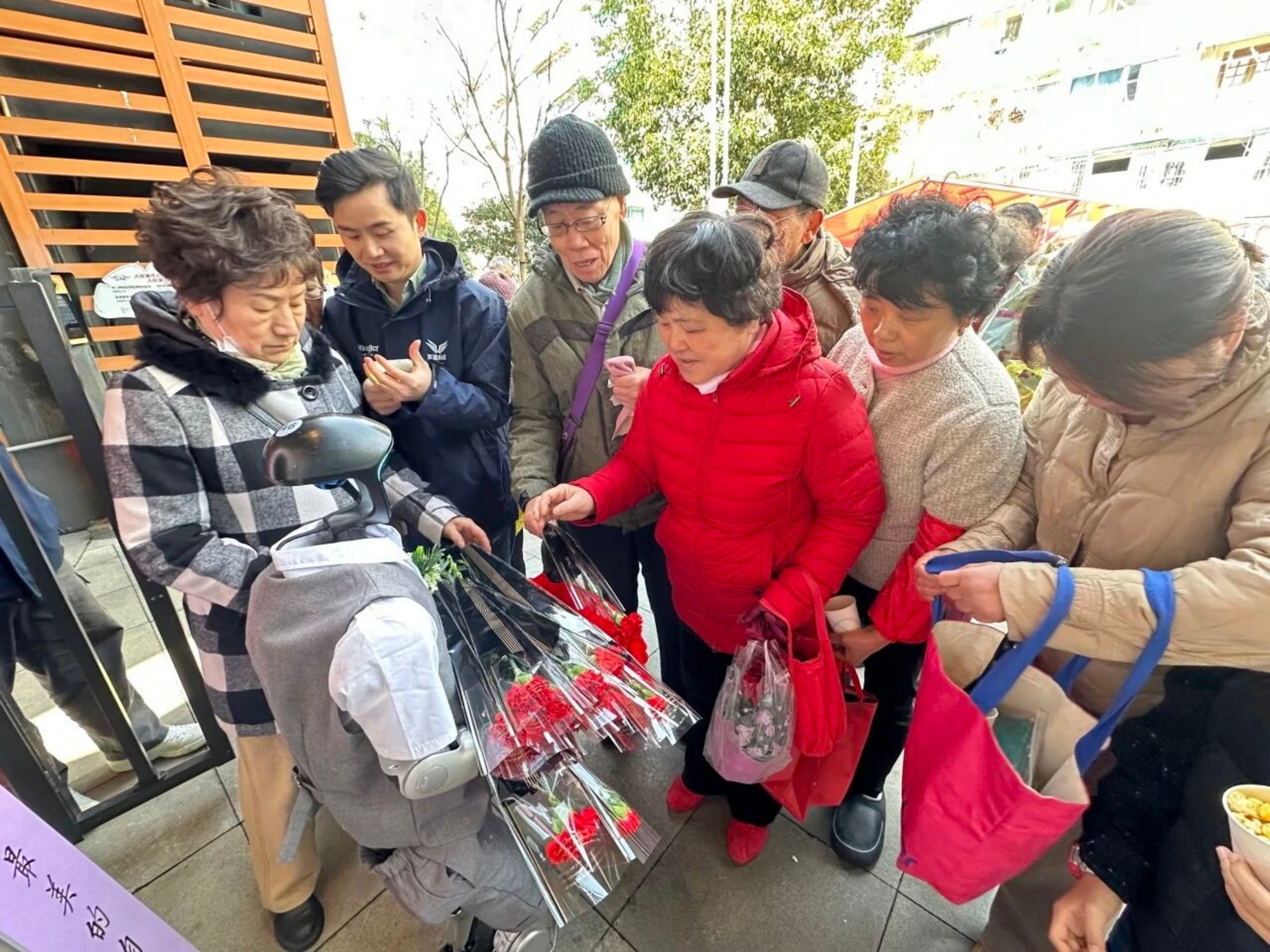 这是发生在仁慧苑公益市集 ——“3·5学雷锋·我为群众办实事”主题党日活动中的一幕。本次活动立足 “十五五”规划开局之年,融入科技创新元素,于是, 这台人形机器人 “志愿者 ”成为 了 全场最大亮点。它不仅与居民亲切互动、合影留念,现场表演欢快舞蹈,更特意为到场的女性居民献上娇艳鲜花,用清脆语音送上“祝各位女神节日快乐、芳华永驻”的诚挚祝福,以科技传递温情,为活动增添别样风采。