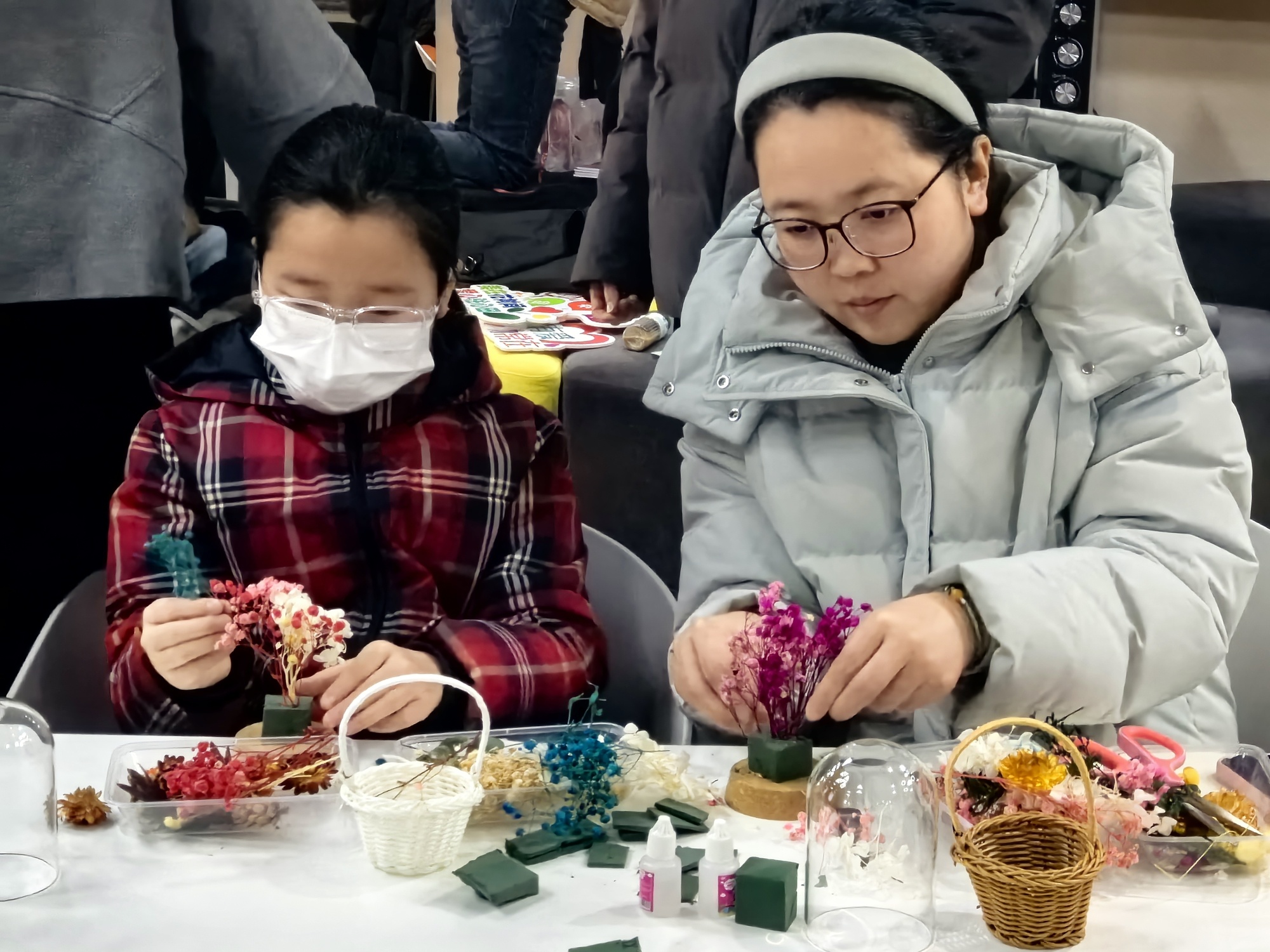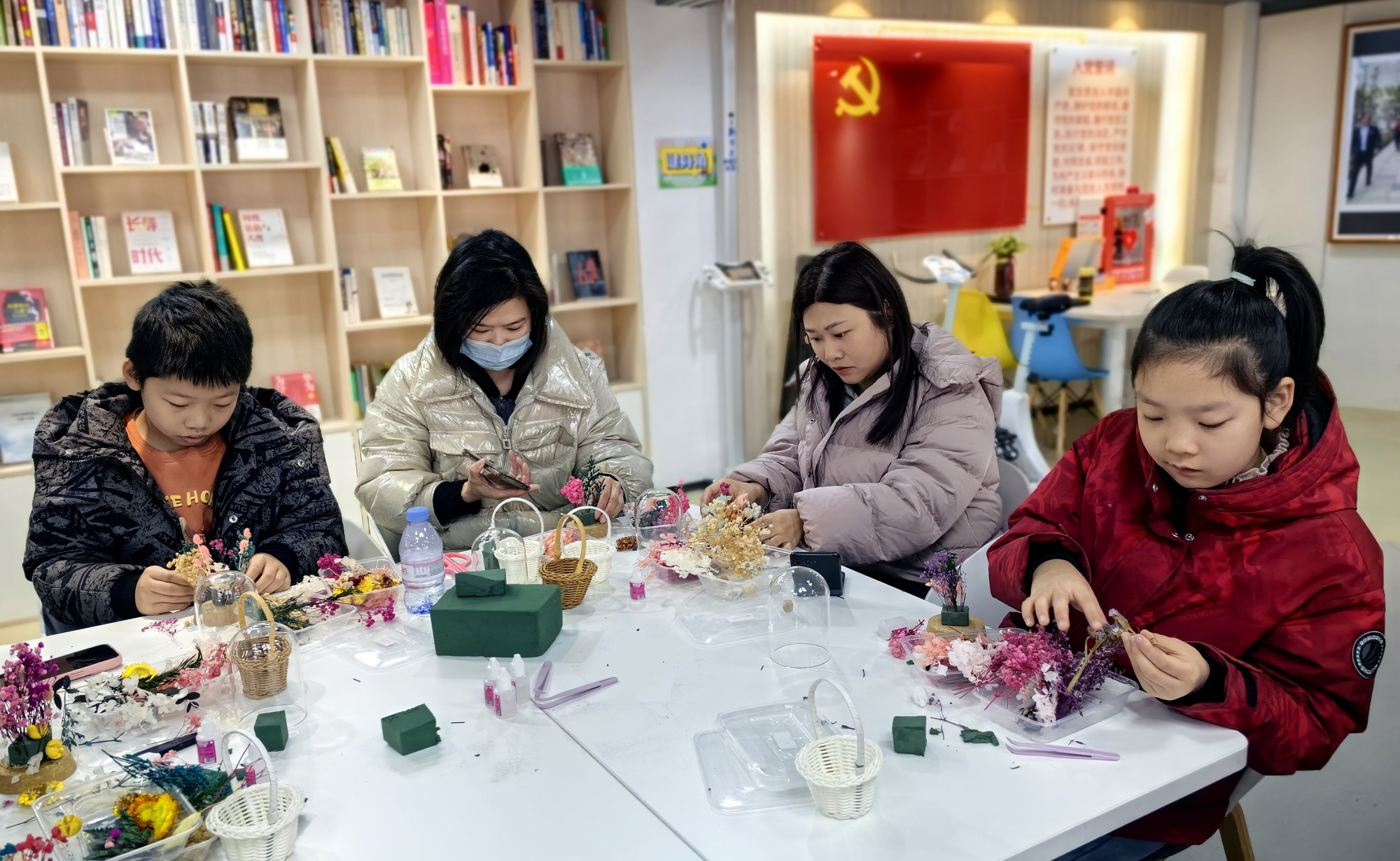 仁慧苑党群服务站里,永生花手工制作活动正在进行。10组亲子家庭围坐一圈,孩子剪花瓣,妈妈粘花枝,其乐融融。