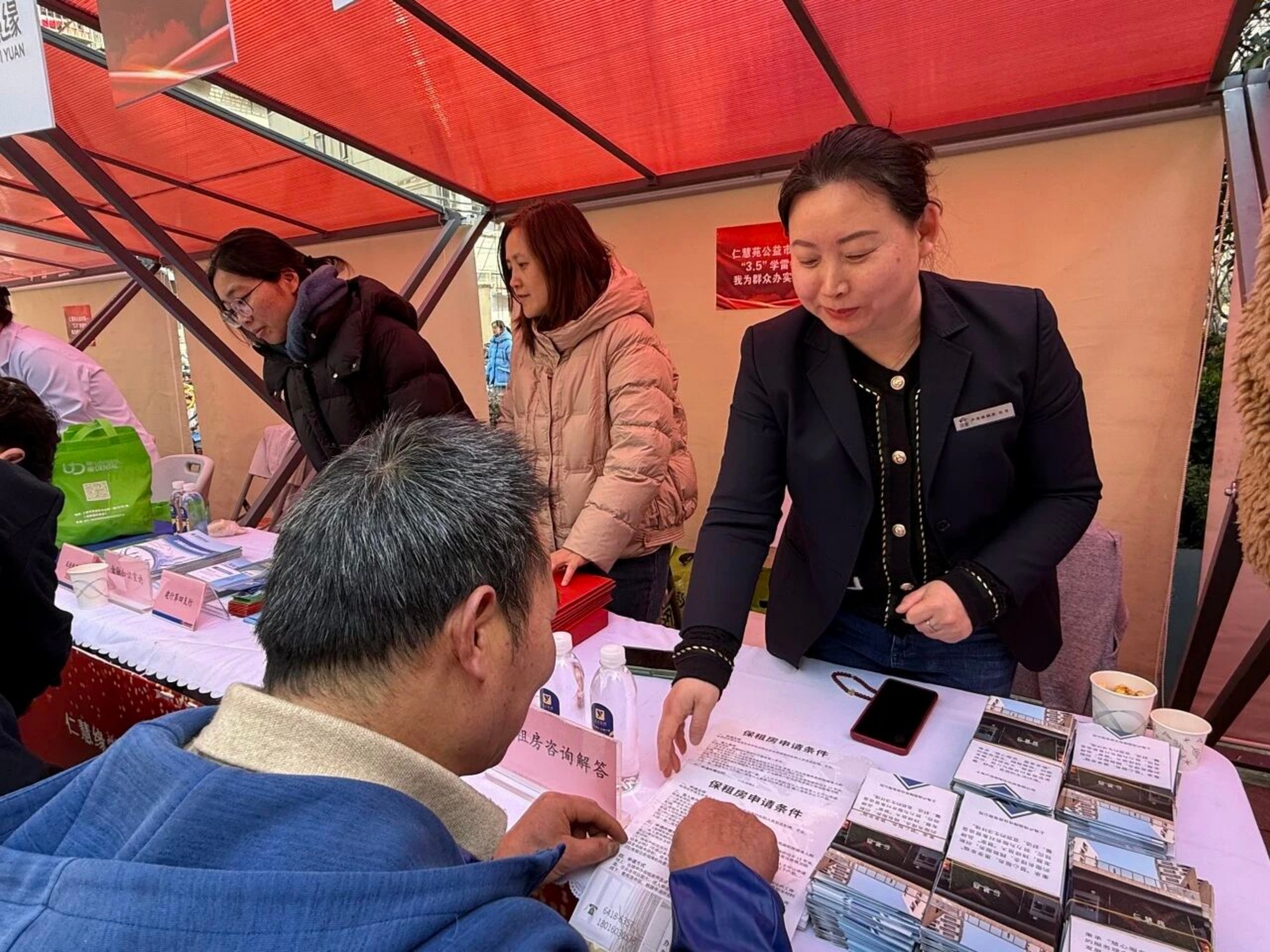 政策咨询区,上海卢湾保障性住房有限公司的摊位前一直没断过人。工作人员拿着宣传页,一遍遍解释保租房的申请条件、租金标准和续租流程。
