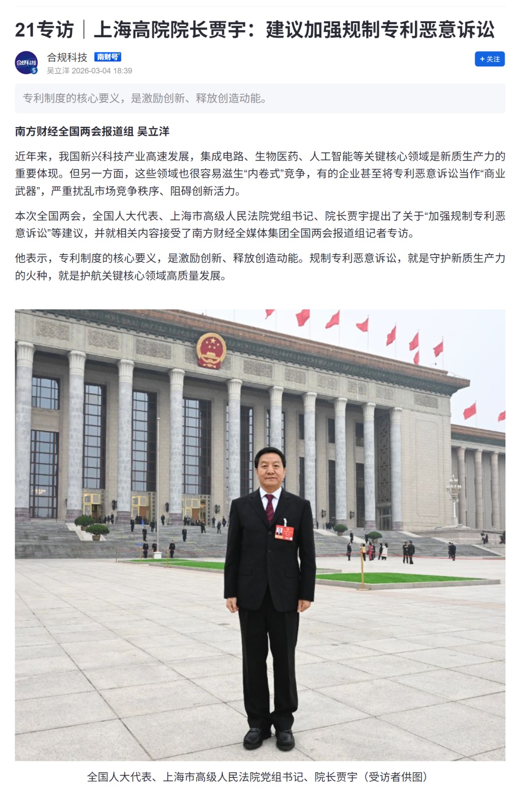 本次全国两会,全国人大代表、上海市高级人民法院党组书记、院长贾宇提出了关于“加强规制专利恶意诉讼”等建议,并就相关内容接受了南方财经全媒体集团全国两会报道组记者专访。