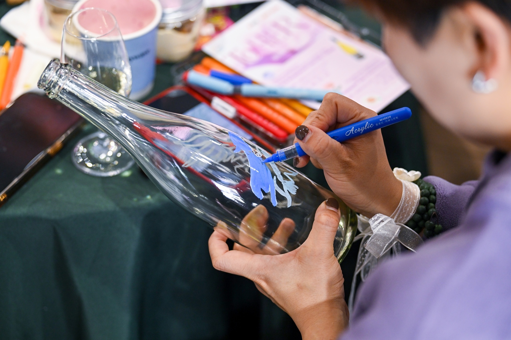 当代艺术家傅冲坐镇“绘香入瓶”工坊,成为沙龙的一大亮点。凭借其艺术经验,现场指导参与者如何用空酒瓶创作成艺术花器,画好的酒瓶不仅是一件纪念品,未来插入一枝鲜花,便是家中最独特的装饰,更能传递环保与无界创作精神。
