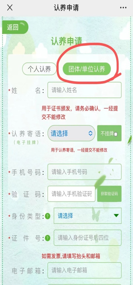 认养申请界面有“个人认养”和“团队/单位认养”两种选项,企业、社会单位等团体在进行认养时,请选择“团队/单位认养”选项。