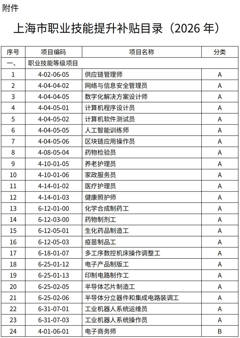 为提升劳动者职业技能,加强急需紧缺和高等级技能人才培养,促进高质量充分就业,根据《关于进一步完善职业技能提升补贴政策的通知》(沪人社规〔2025〕7号)有关规定,现将上海市职业技能提升补贴目录(2026年)予以发布。