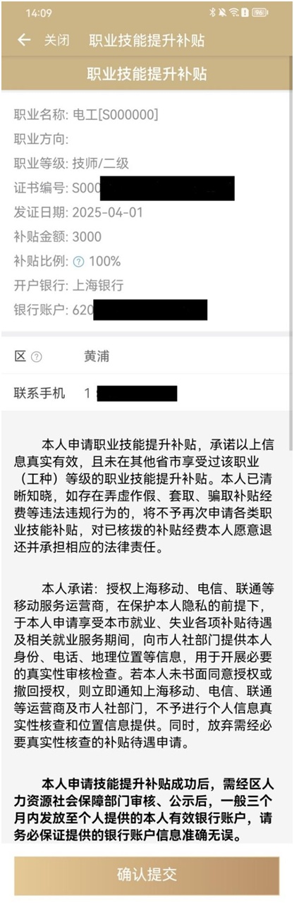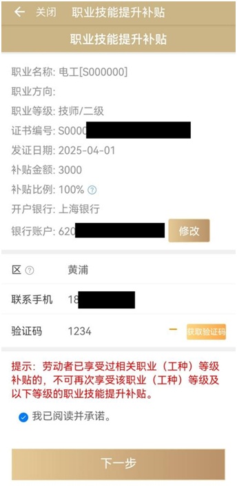 点击需要申请的证书信息,确认补贴金额、补贴比例及个人银行账户信息,如需修改银行账户信息,可点击【修改】按钮维护银行账户信息。
