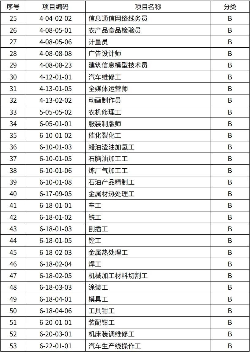 急需紧缺项目(B类)补贴标准分别为初级工(五级)1500元/人,中级工(四级)2000元/人,高级工(三级)2700元/人,技师(二级)3200元/人,高级技师(一级)3700元/人,不区分等级的职业资格和专项职业能力证书补贴标准为800元/人。