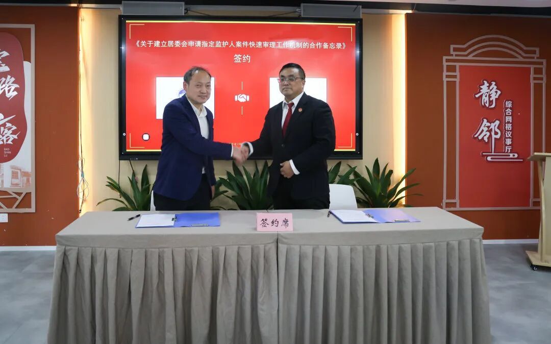 庭审结束后,静安区人民法院党组成员、副院长傅朱钢与宝山路街道党工委书记胡建文共同发布《静安区宝山路街道关于居委会申请担任特殊人员监护人的操作指引》(以下简称《操作指引》)《宝山路街道关于居委会申请担任特殊人员监护人的工作办法(试行)》(以下简称《工作办法》),并签署《关于建立居委会申请指定监护人案件快速审理工作机制的合作备忘录》(以下简称《备忘录》)。《操作指引》《工作办法》两份指导文件,为居委会依法履职提供了“说明书”和“路线图”,并形成了“5+6+7”工作体系: