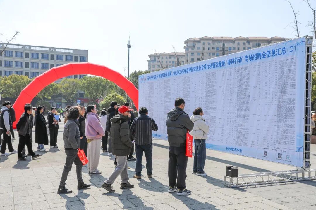 3月14日上午,金山区2026年春季促进就业专项行动暨张堰镇“春风行动”专场招聘会在张堰镇人民政府广场举行。