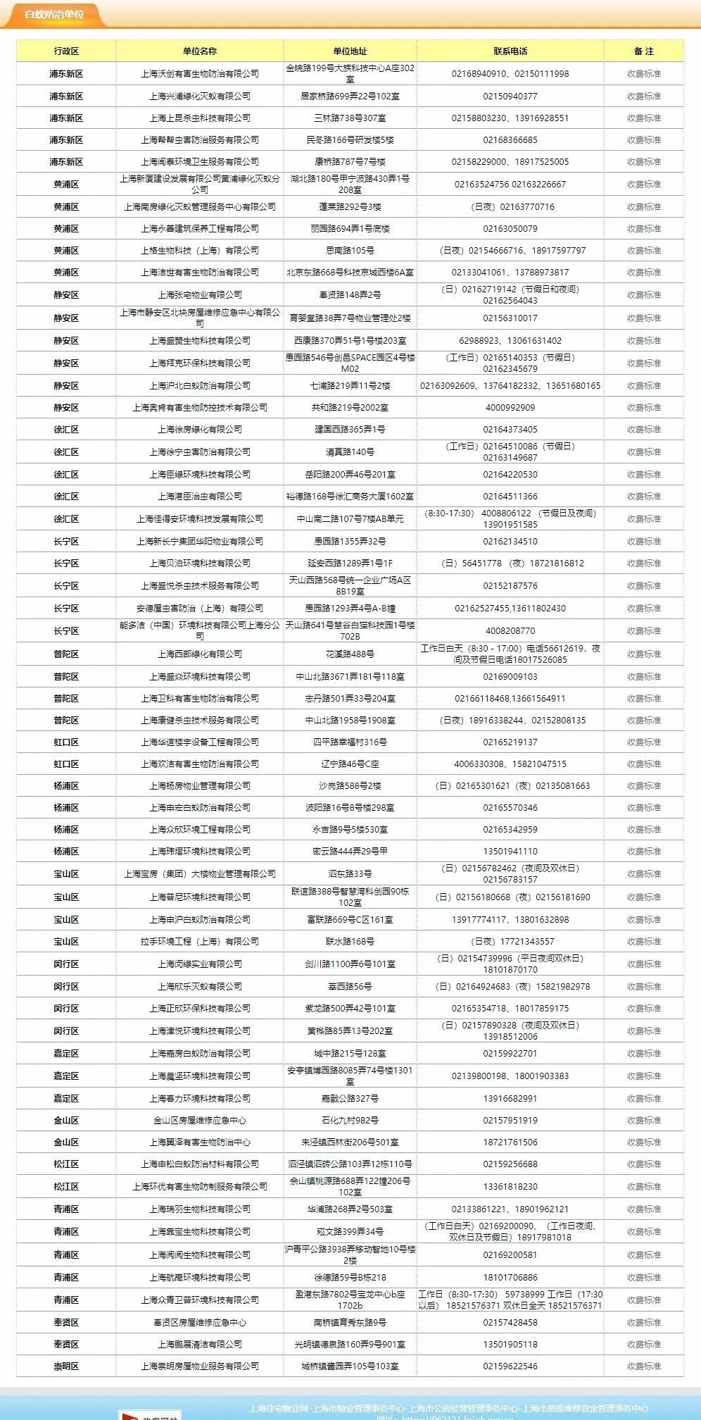 本市16个行政区均有正规白蚁防治企业,可通过上述渠道就近选择,59家正规企业名录可在上海住宅物业网查询哦!