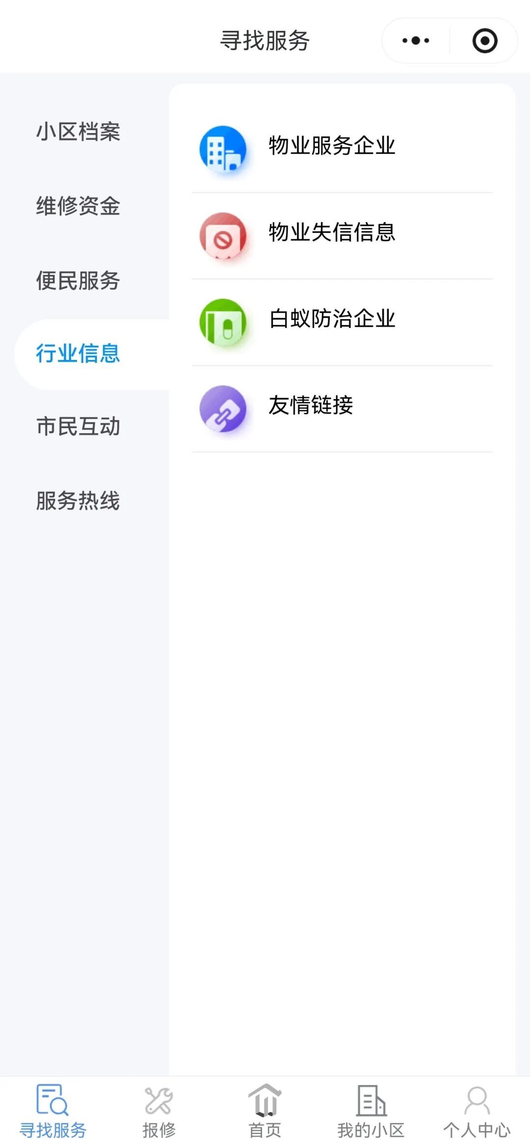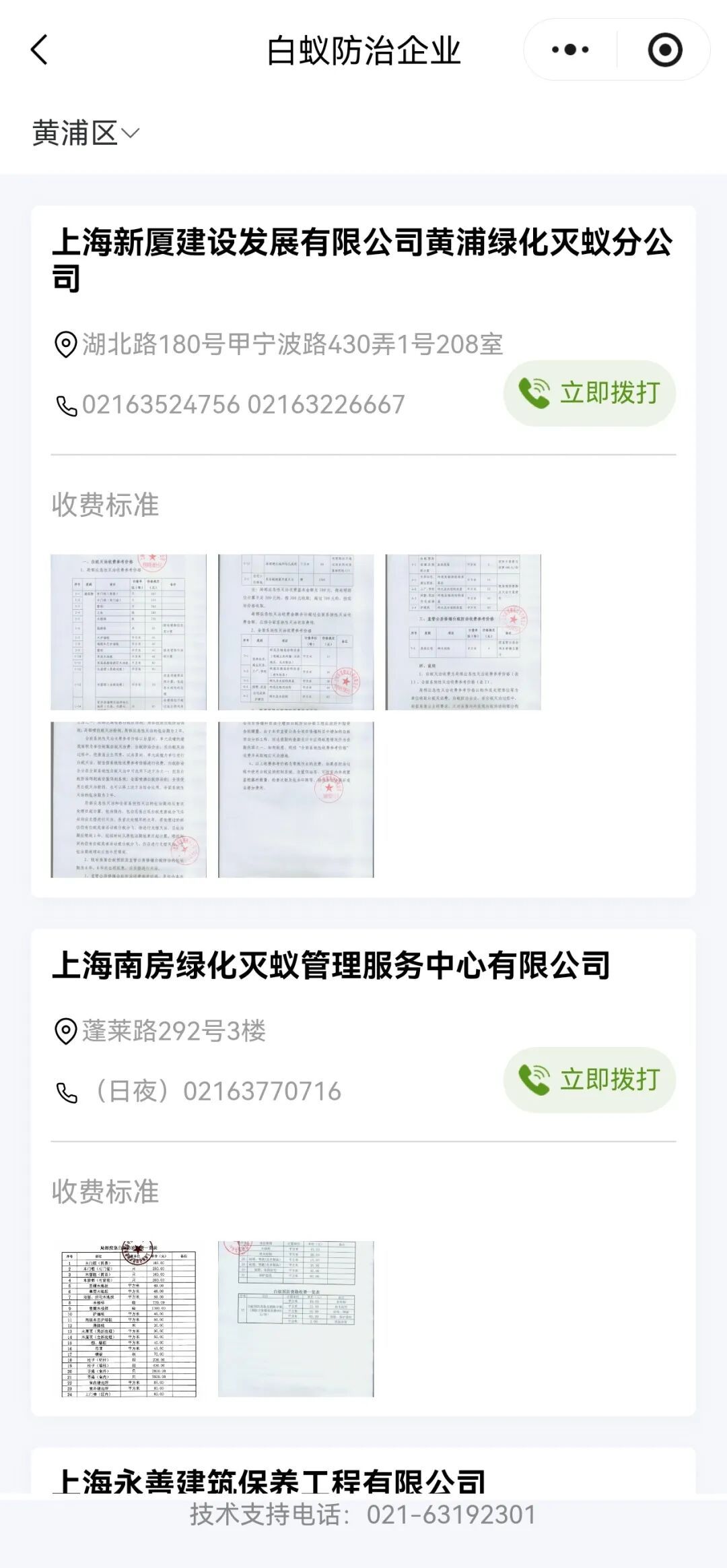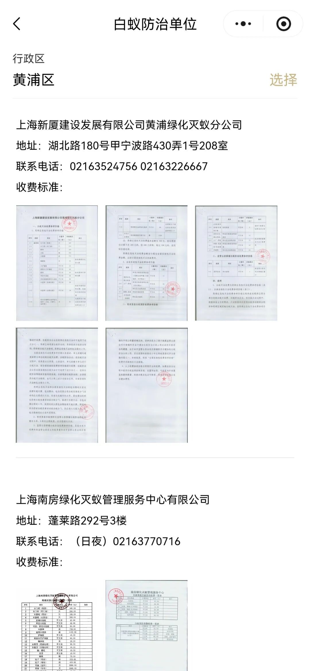 注册“上海物业”小程序,绑定小区后,可在“上海物业”小程序的“寻找服务”菜单中的“白蚁防治企业”名录中查询白蚁防治企业的联系电话、收费标准等。