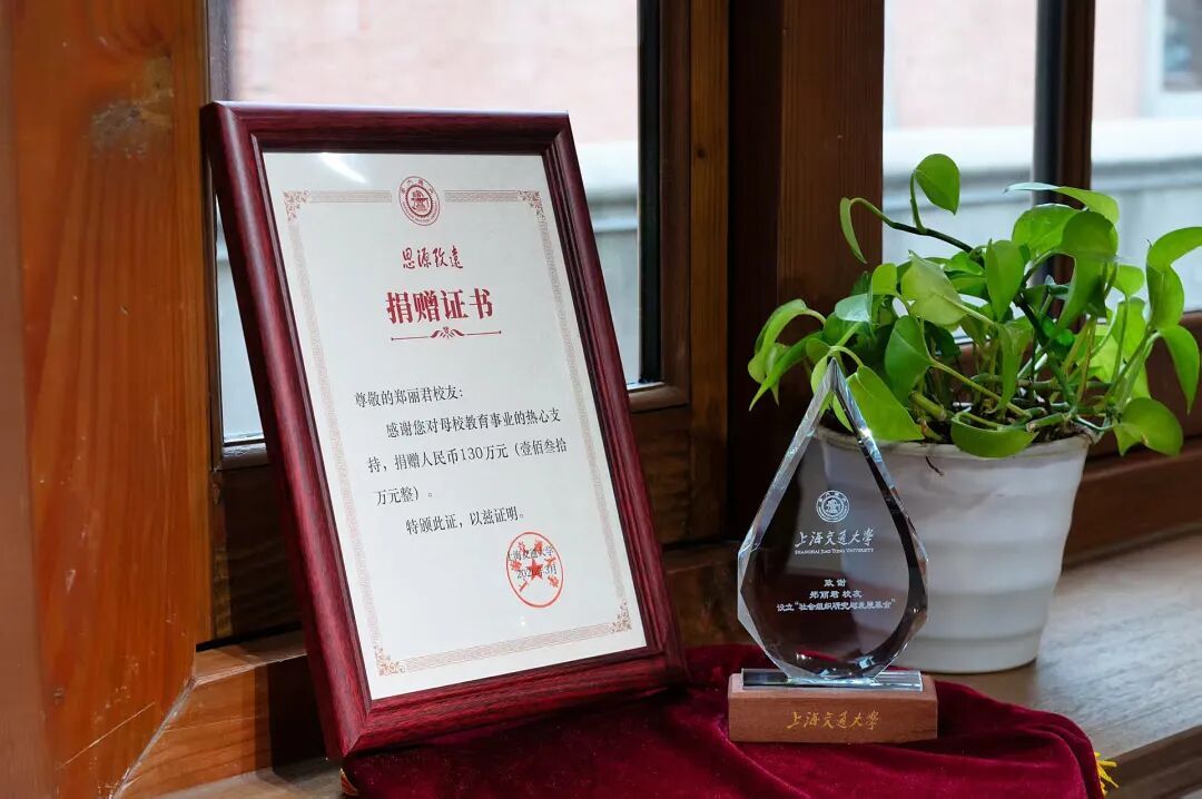 在热烈的掌声中,上海交大2018届校友、上海静安幸福益站志愿服务中心理事长、上海硕风文化旅游(集团)有限公司董事长、“阳光育人计划”静安站站长郑丽君与上海交大教育发展基金会秘书长汪雨申签署捐赠协议,共同设立“社会组织研究与发展基金”。周承代表学校向郑丽君颁发捐赠证书与感谢牌,对她回馈母校、支持教育事业发展的善举表示诚挚感谢。