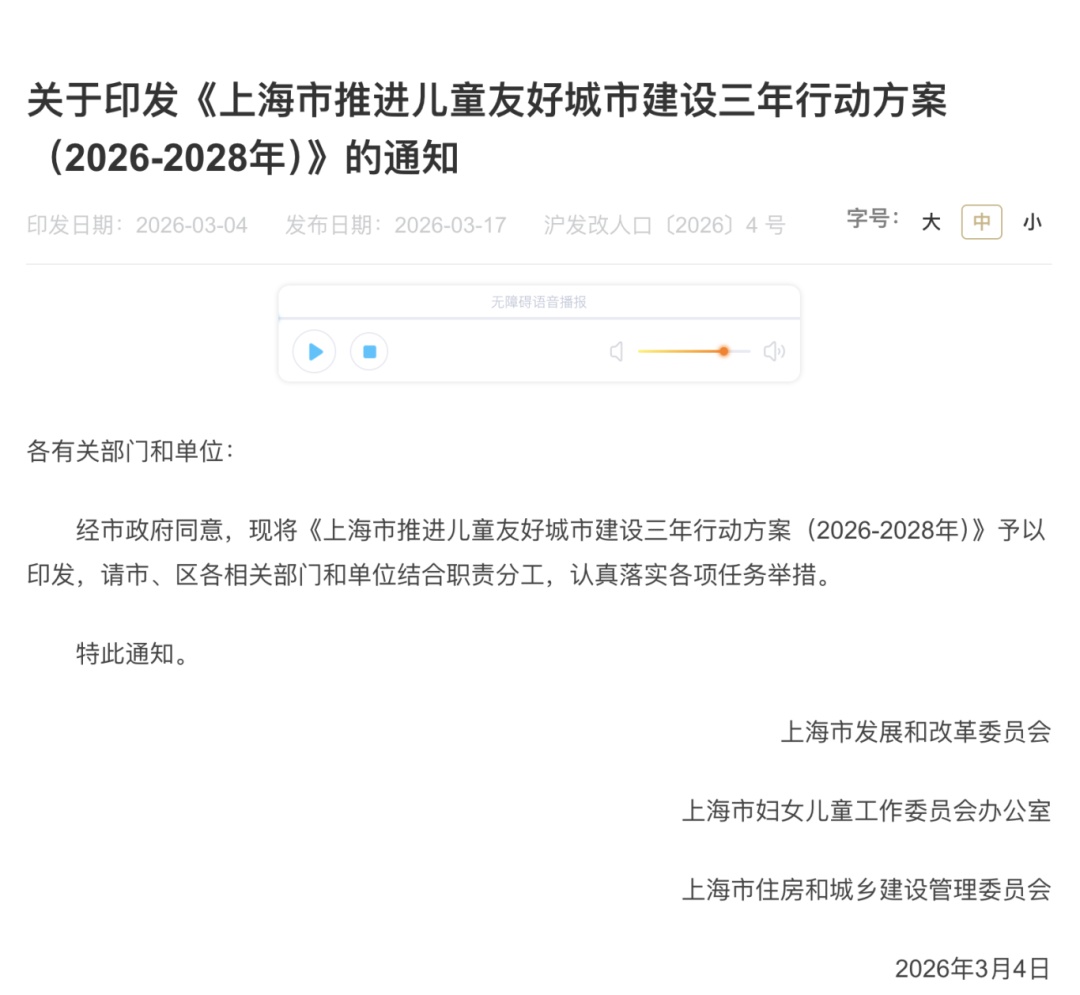 近日,上海市发改委、市妇儿工委办、市住建委联合印发了《上海市推进儿童友好城市建设三年行动方案(2026—2028年)》。未来三年内,上海将通过六大方面30项具体任务,系统性推进儿童友好城市建设,为儿童成长发展提供更适宜的条件、环境和服务。