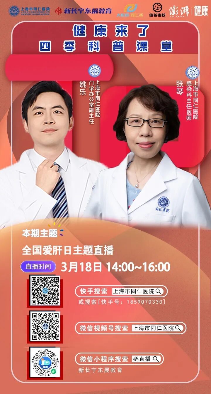 今天(3月18日)14:00—16:00,“上海长宁”App将与上海市同仁医院“大虹桥·同仁荟健康直播”共同直播:全国爱肝日主题直播。