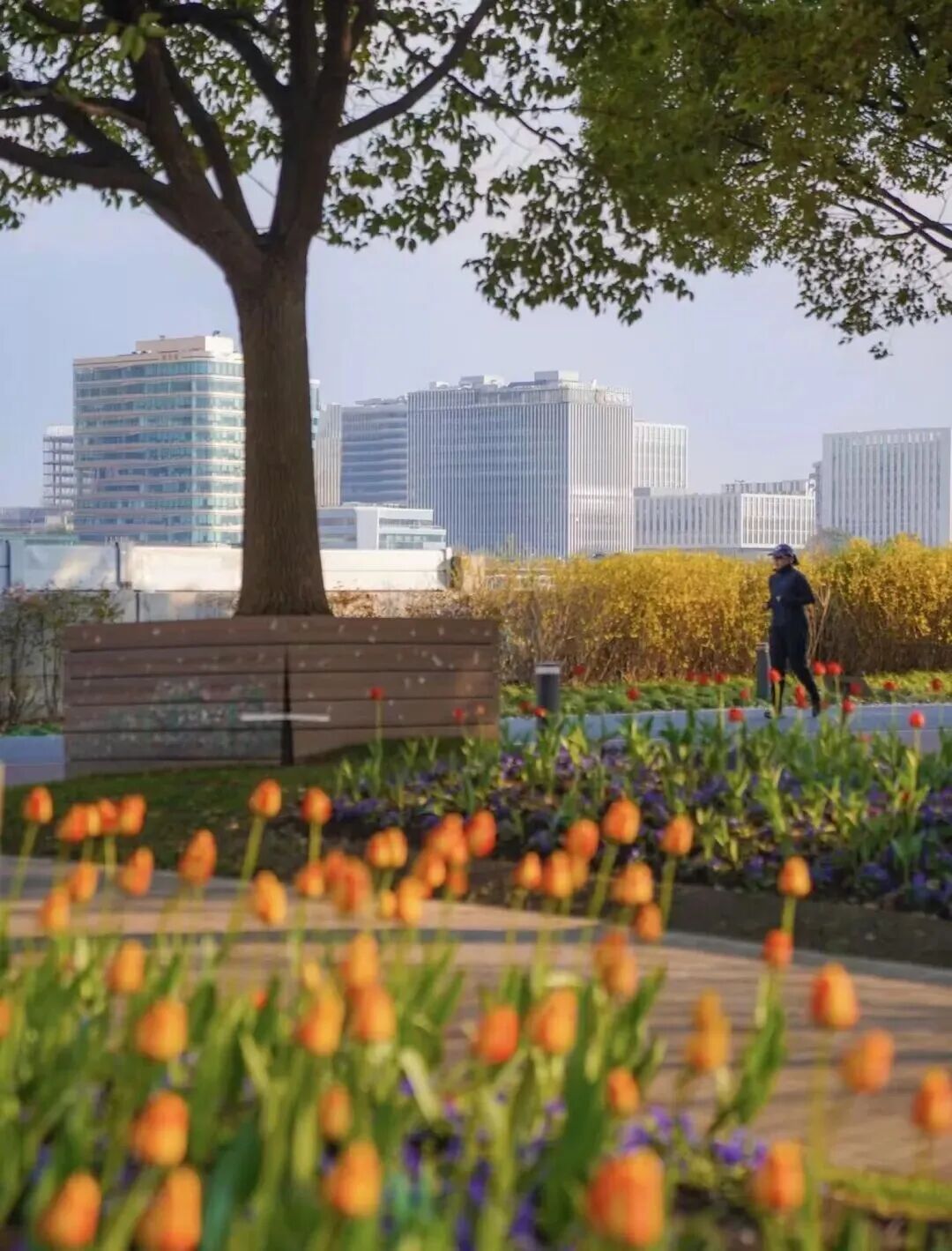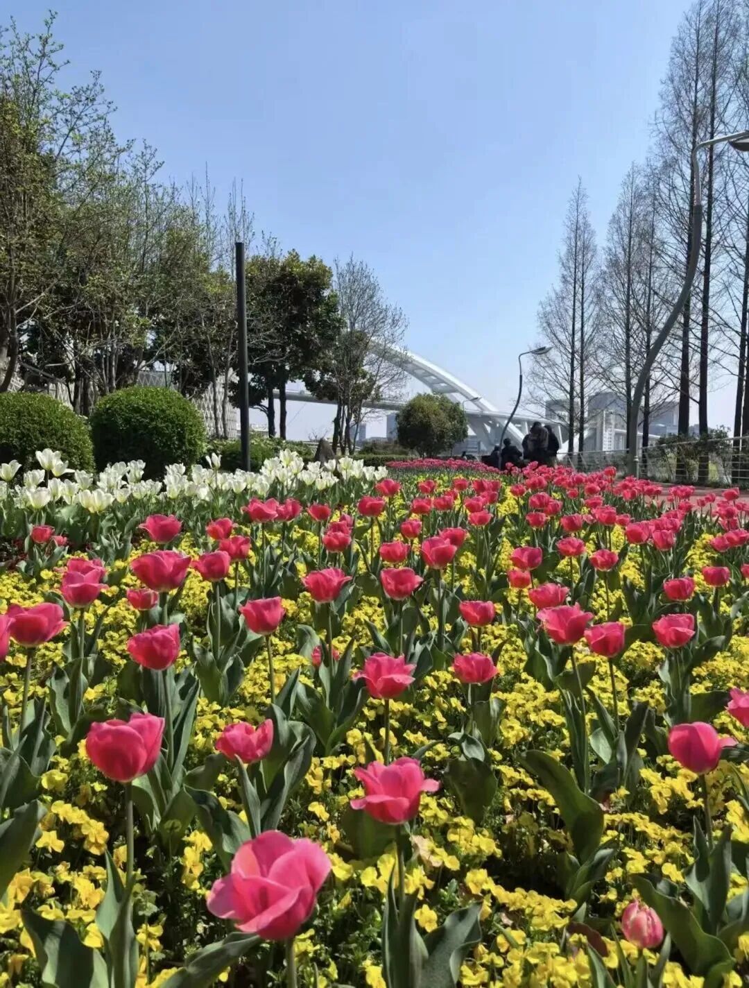 继续向南,来到充满春日气息的琴键春园。樱花树错落分布,粉白花瓣随风轻扬。还有花境之中,大面积郁金香正竞相绽放,红、黄、粉色交织铺展。骑行其间,抬眼是江景开阔,低头是花海缤纷,滨江春光在这里格外明媚。