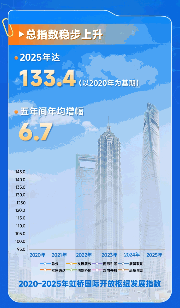 虹桥国际开放枢纽发展指数总体呈现稳步上升态势,2025年达133.4(以2020年为基期),五年间年均增幅为6.7。发展质效分指数2025年为125.2,五年间年均增长5.0;商务引领分指数2025年达136.9,五年间年均增长7.4;枢纽通达分指数2025年达139.1,五年间年均增长7.8……一起来“数”说~