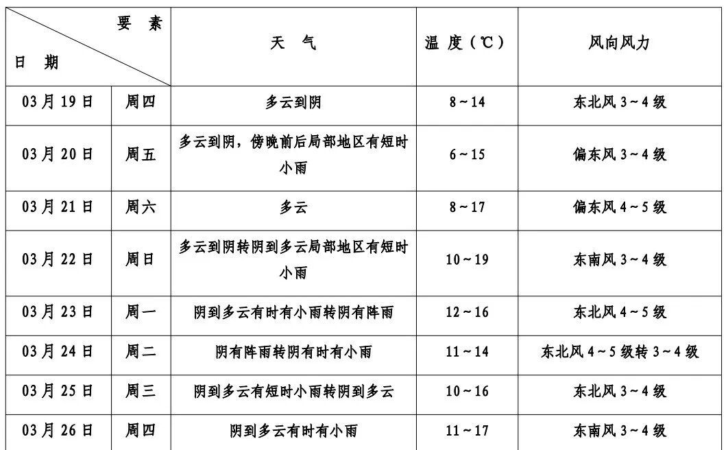明天是农历二月二,又进入“春分”节气。明天早晨前后西部、北部地区有雾,早出门注意道路交通安全。白天的天空状况和今天类似,多云到阴为主,傍晚前后云系更多,局部有可能飘些短时小雨,影响不大。早间气温较低,市区仅有6℃,早出晚归仍需厚些的外套,预计最高气温在15℃附近,偏东风3~4级,相对湿度在95%—45%之间。