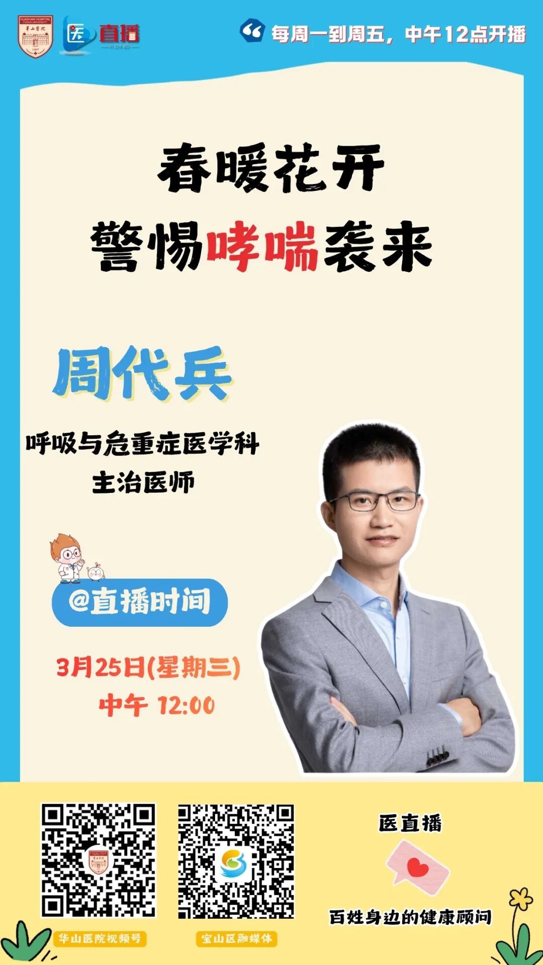 春回大地,万物复苏,但对于哮喘及过敏体质人群而言,这个季节也暗藏呼吸危机。花粉、尘螨、柳絮、忽冷忽热的空气……这些春季常见的“隐形杀手”都可能诱发气道高反应性,导致哮喘急性发作。本期医直播,复旦大学附属华山医院呼吸与危重症医学科主治医师周代兵,带您正确认识春季哮喘,从识别早期信号到规范用药,助您畅快呼吸,安稳度春。