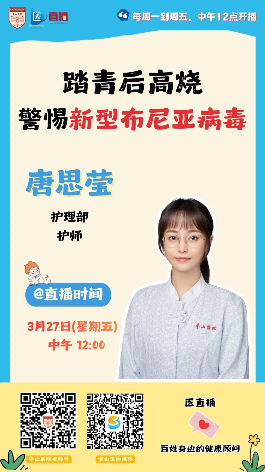 “去野外被蜱虫咬了没当回事,高烧、乏力以为是感冒,结果越拖越重。”这些正是新型布尼亚病毒感染的常见表现!新型布尼亚病毒主要通过蜱虫叮咬传播,起病急、易误当感冒,严重可危及生命。 本期医直播,复旦大学附属华山医院护理部护师唐思莹,带你了解:如何防蜱虫、早识别、做好个人与家庭防护。