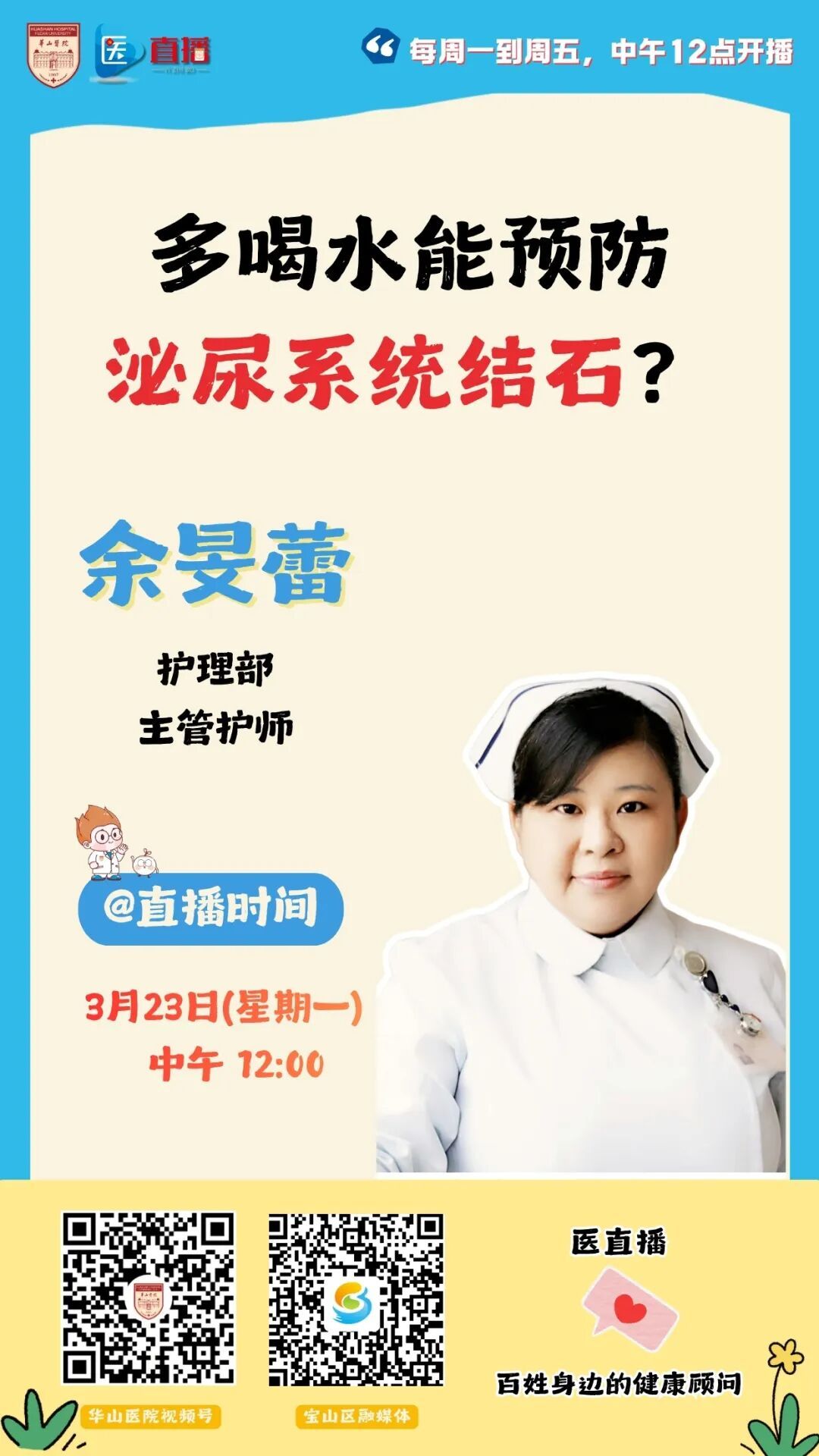 多喝水是预防泌尿系统结石的基础,但需结合个人体质特点调整饮水策略,并配合饮食、运动等综合管理,才能有效降低结石风险。本期医直播,复旦大学附属华山医院护理部主管护师余旻蕾,将系统讲解如何科学预防泌尿系统结石,从日常细节入手守护泌尿健康。
