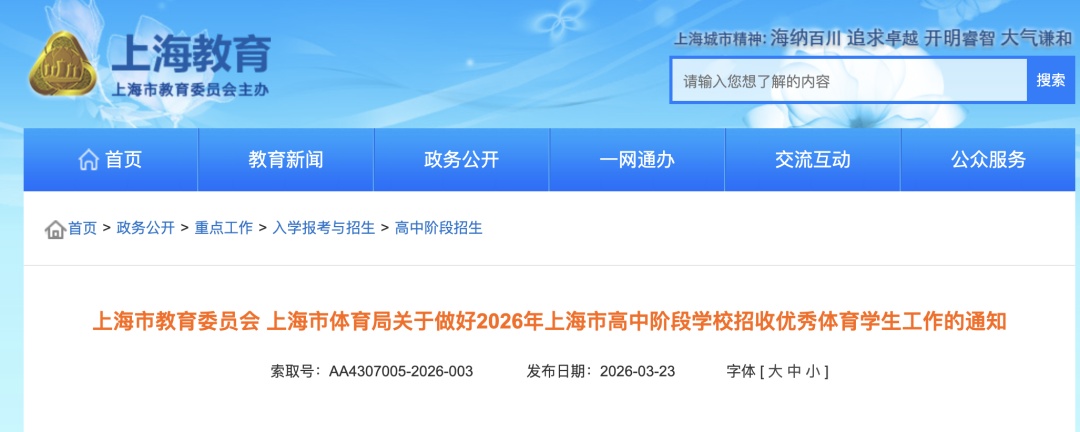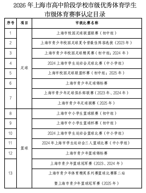 近日,上海市教委、上海市体育局发布关于做好2026年上海市高中阶段学校招收优秀体育学生工作的通知。
