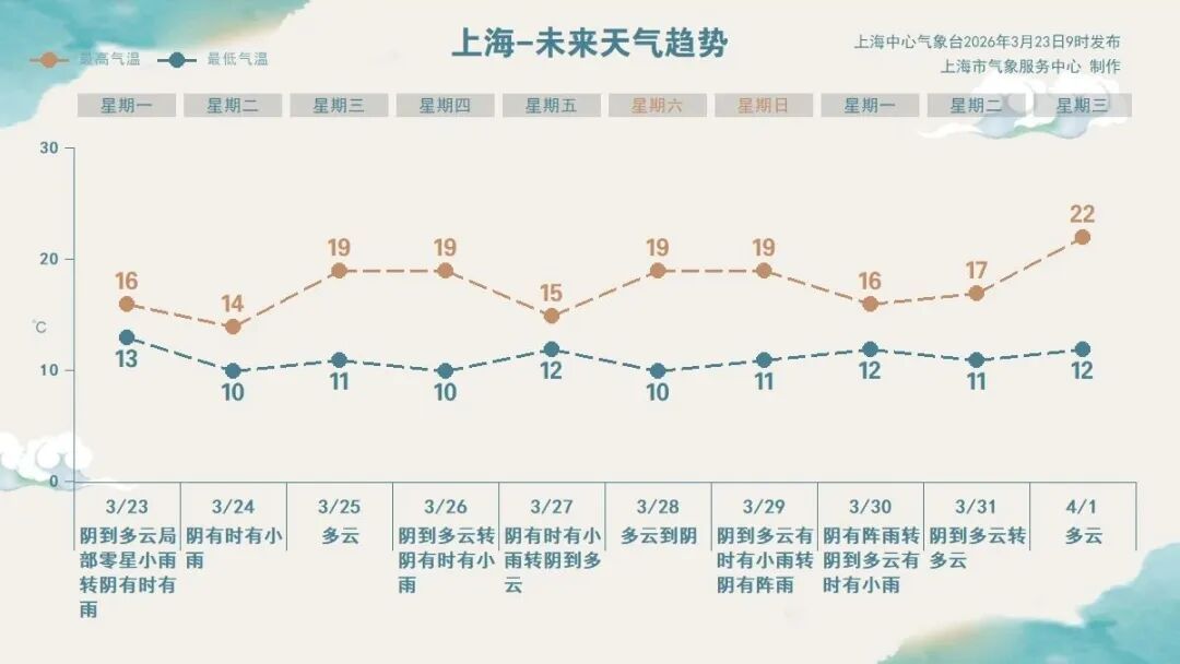 上海中心气象台预计,明日依然以阴有时有雨为主,降雨较为明显。周三雨止阳光上线,到周四夜间再度转雨。本周气温略有起伏,最低气温保持在10℃以上,最高气温上下浮动。此外,由于本周将迎来两次雨水过程,周二和周五气温下降较明显,周中和双休日最高气温在19℃左右,体感较为舒适。本周天气变数较多,请市民朋友们及时关注最新天气预报。